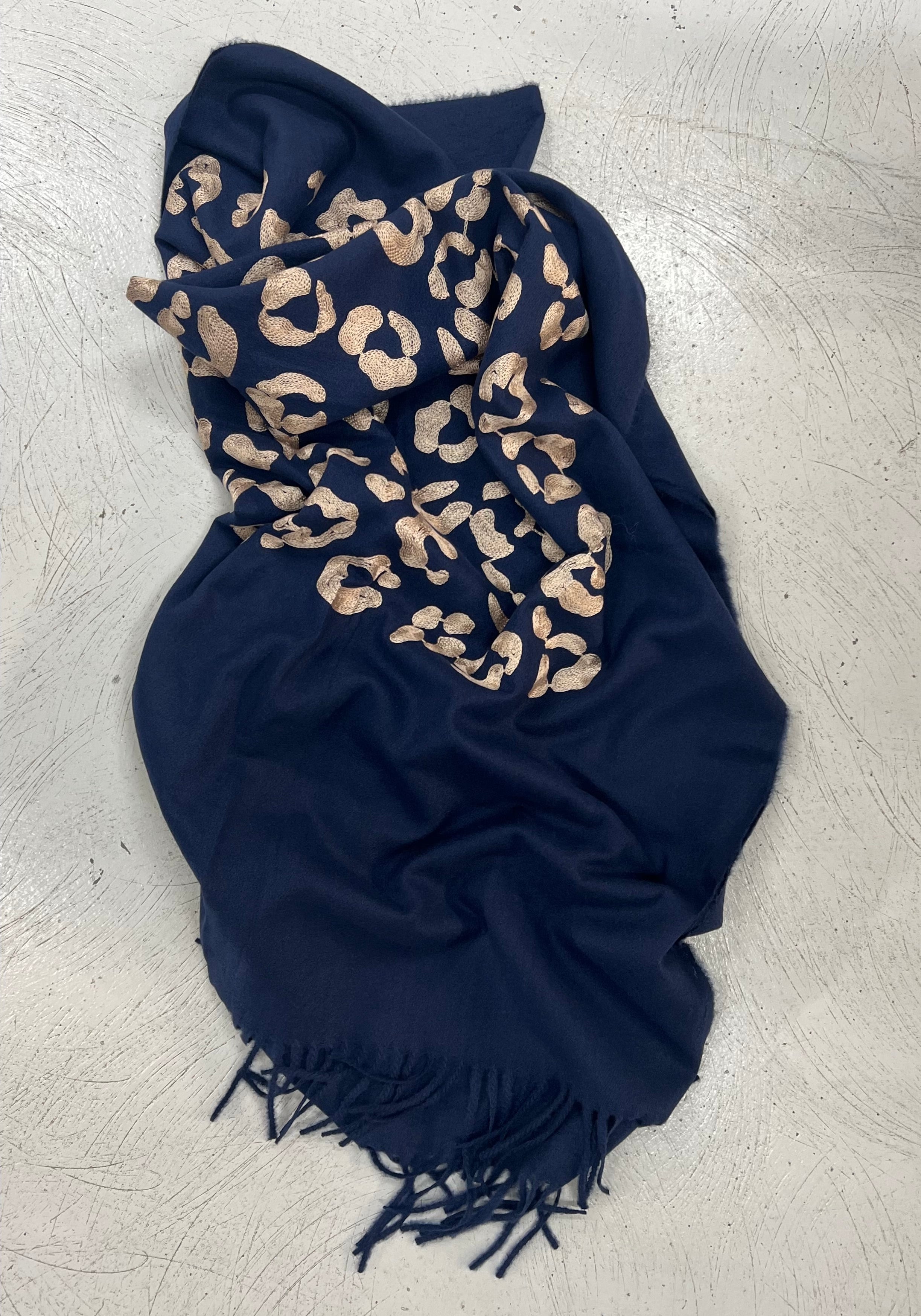 En mjuk och elegant halsduk i generös storlek med broderat leopardmönster. Den följsamma viskosen ger ett vackert fall och gör halsduken lika fin att bära som sjal över axlarna eller svept runt halsen. Fransarna i ändarna ger ett mjukt och stilfullt avslut.