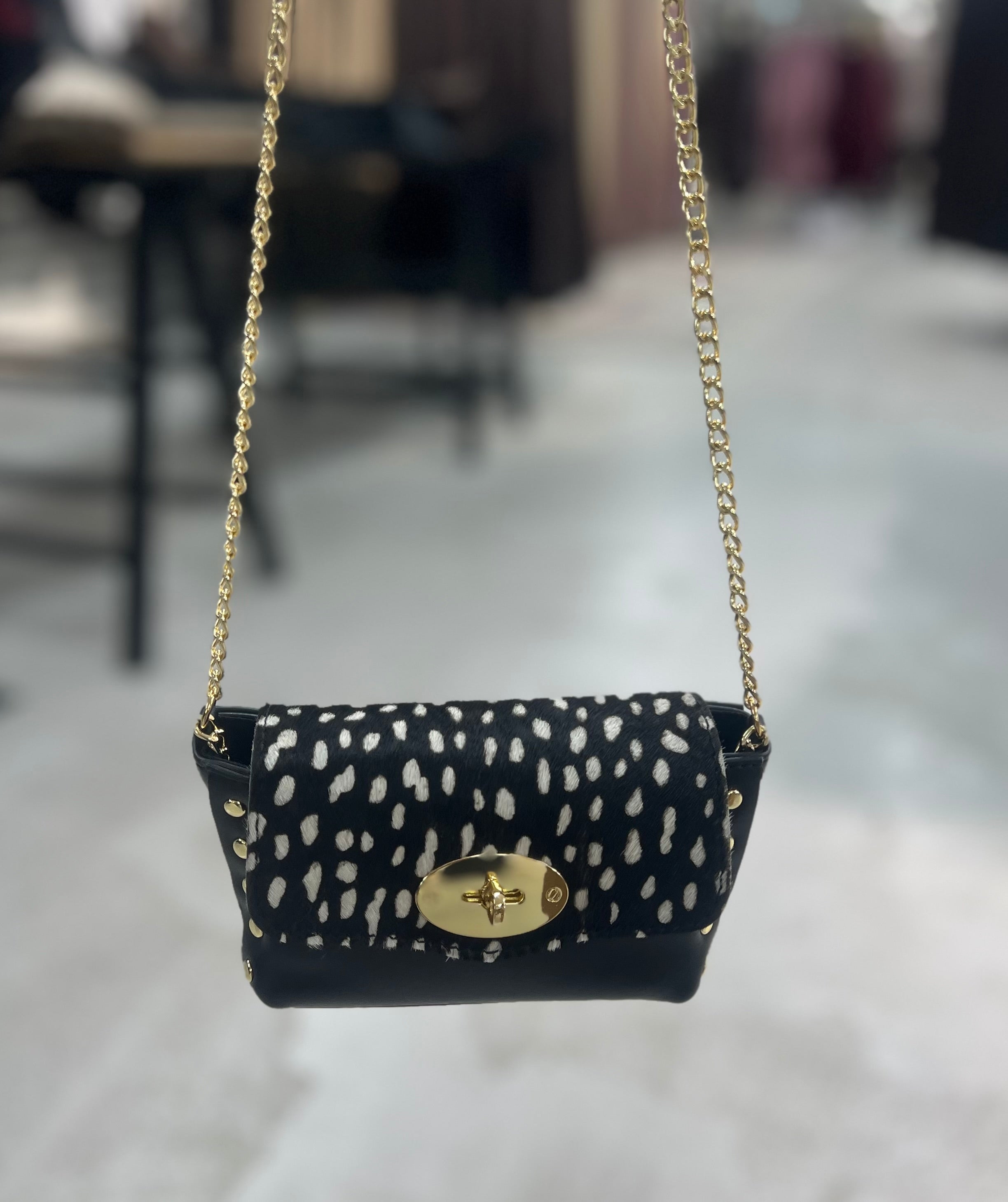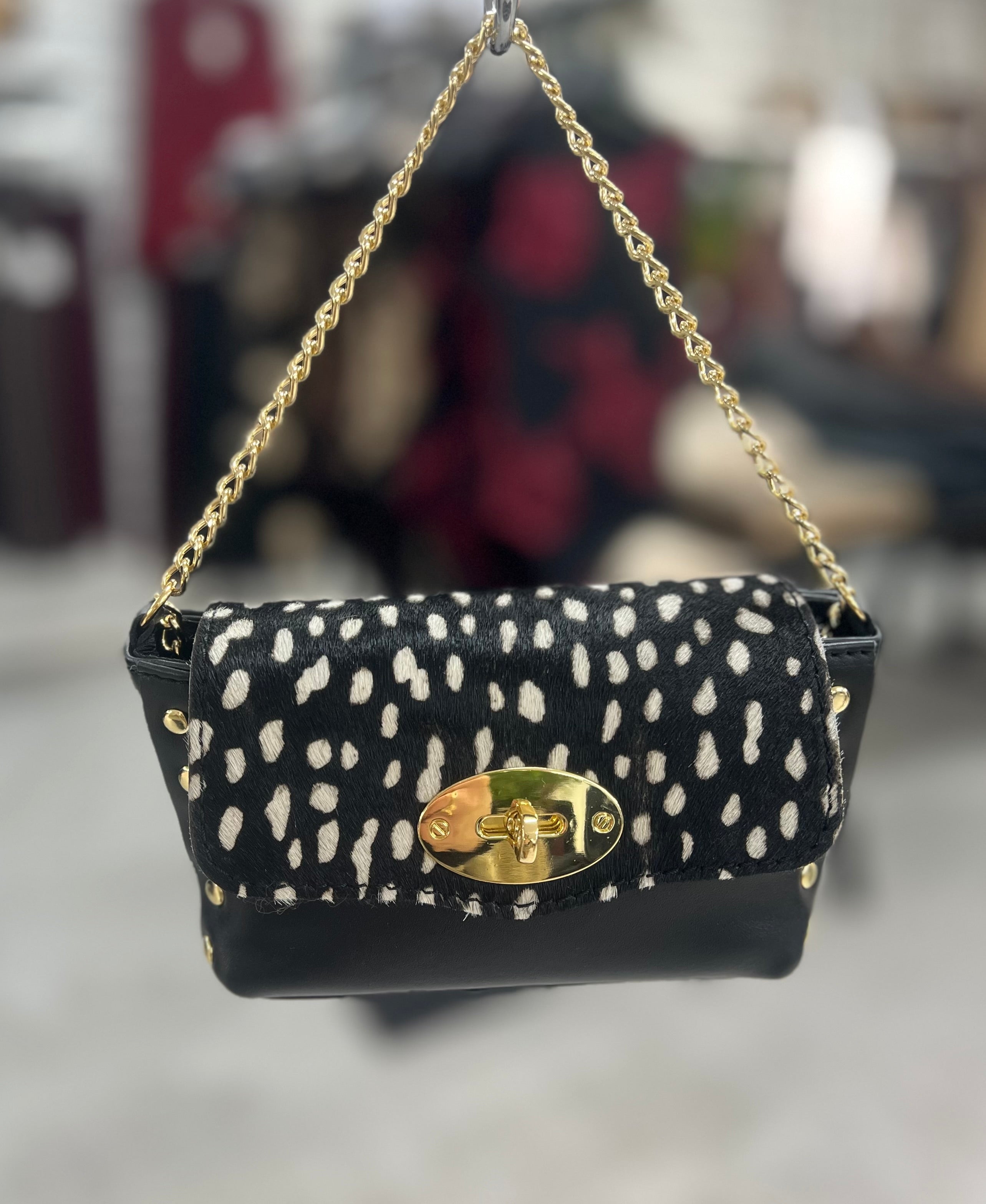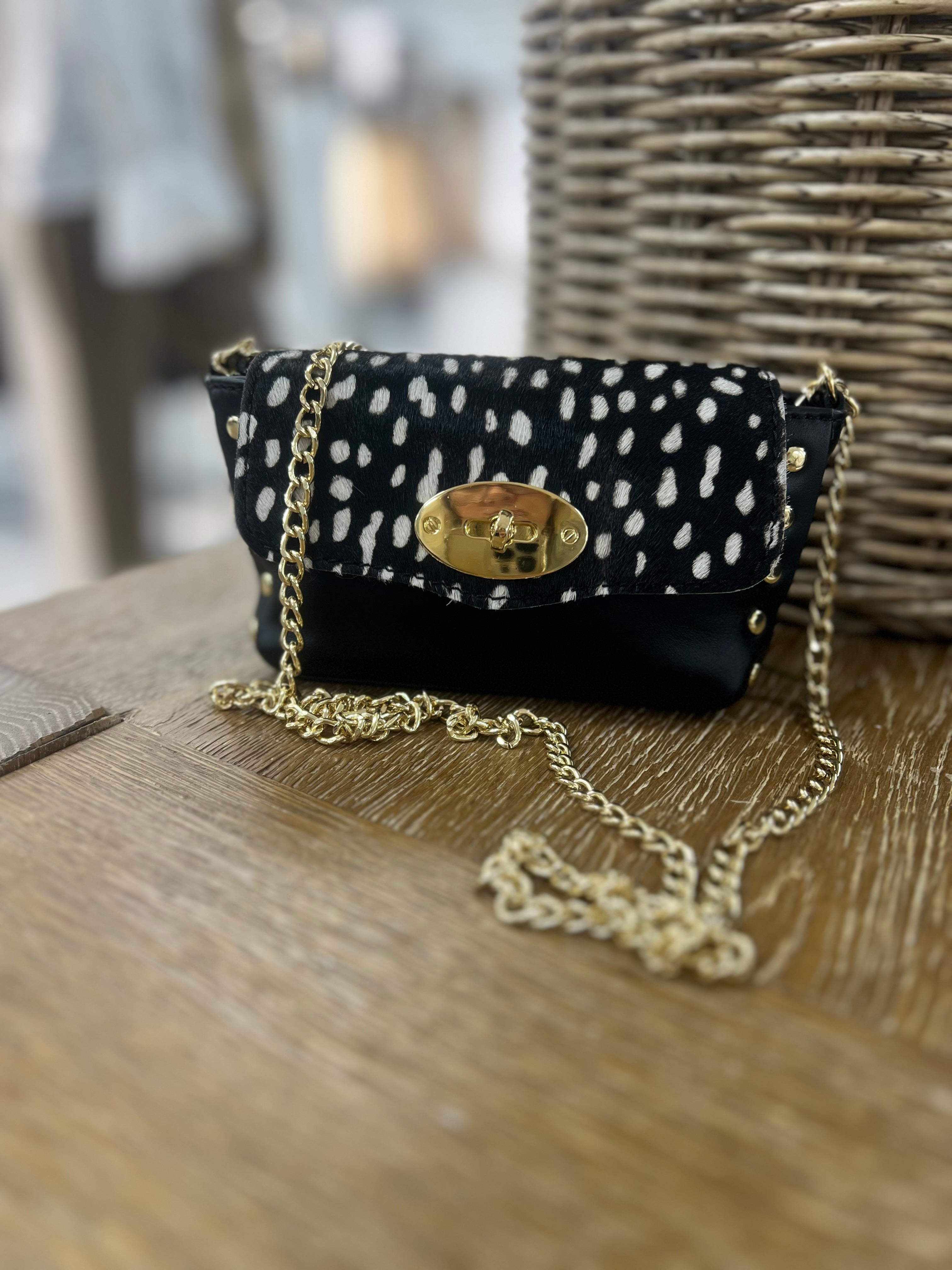 En stilren och modern mobilväska i äkta läder, perfekt när du vill bära det viktigaste med både elegans och attityd. Väskan har ett lock i trendigt Zebra-, Ko- eller Dalmatinmönster, vilket ger varje modell ett unikt uttryck. Guldiga detaljer och en snygg kedjerem fulländar den lyxiga designen.