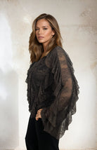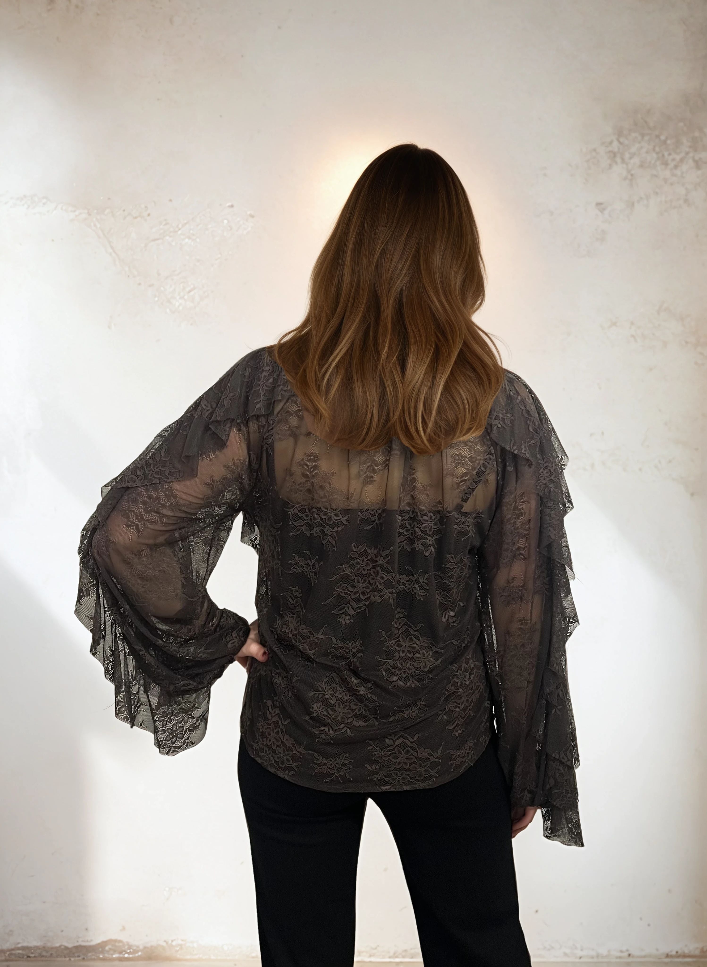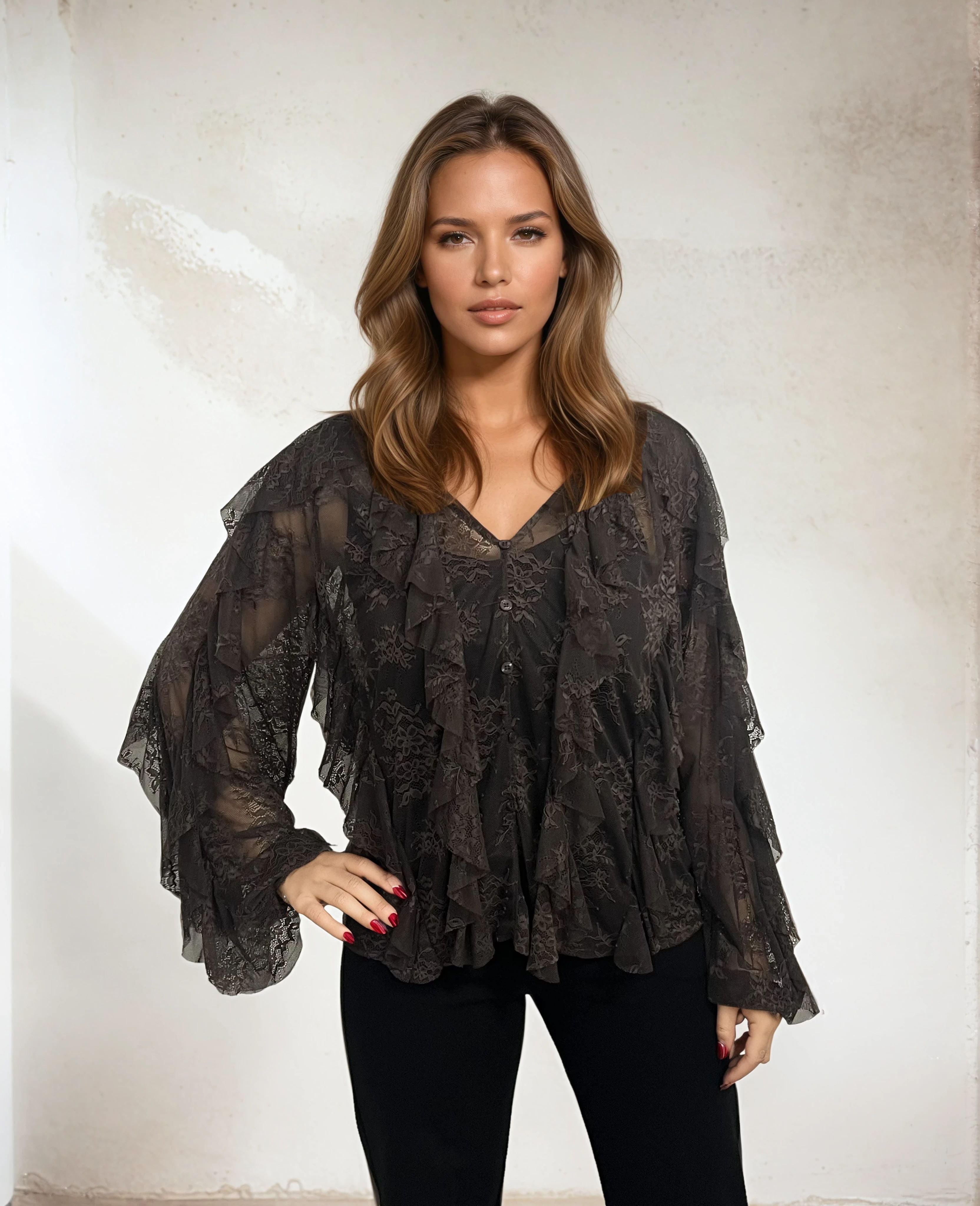 Låt romantiken möta elegans i Blus Nellie med volang från Mirelle Design. En sofistikerad spetsblus med vackra volanger framtill som ger en mjuk och feminin silhuett. Den transparenta spetsen skapar ett exklusivt och luftigt intryck, samtidigt som den följsamma passformen gör blusen bekväm att bära hela dagen.