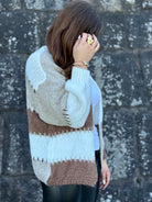 En mjuk och trendig stickad kofta i onesize-modell, tillverkad i Italien. Designad i blockmönster med fält i beige, offwhite och brun. Mellan varje fält löper dekorativa streck som ger extra detaljkänsla. Modellen är v-ringad och har en lätt ballongformad ärm för en modern och avslappnad siluett. Utan knäppning, vilket gör den enkel att bära lager på lager.