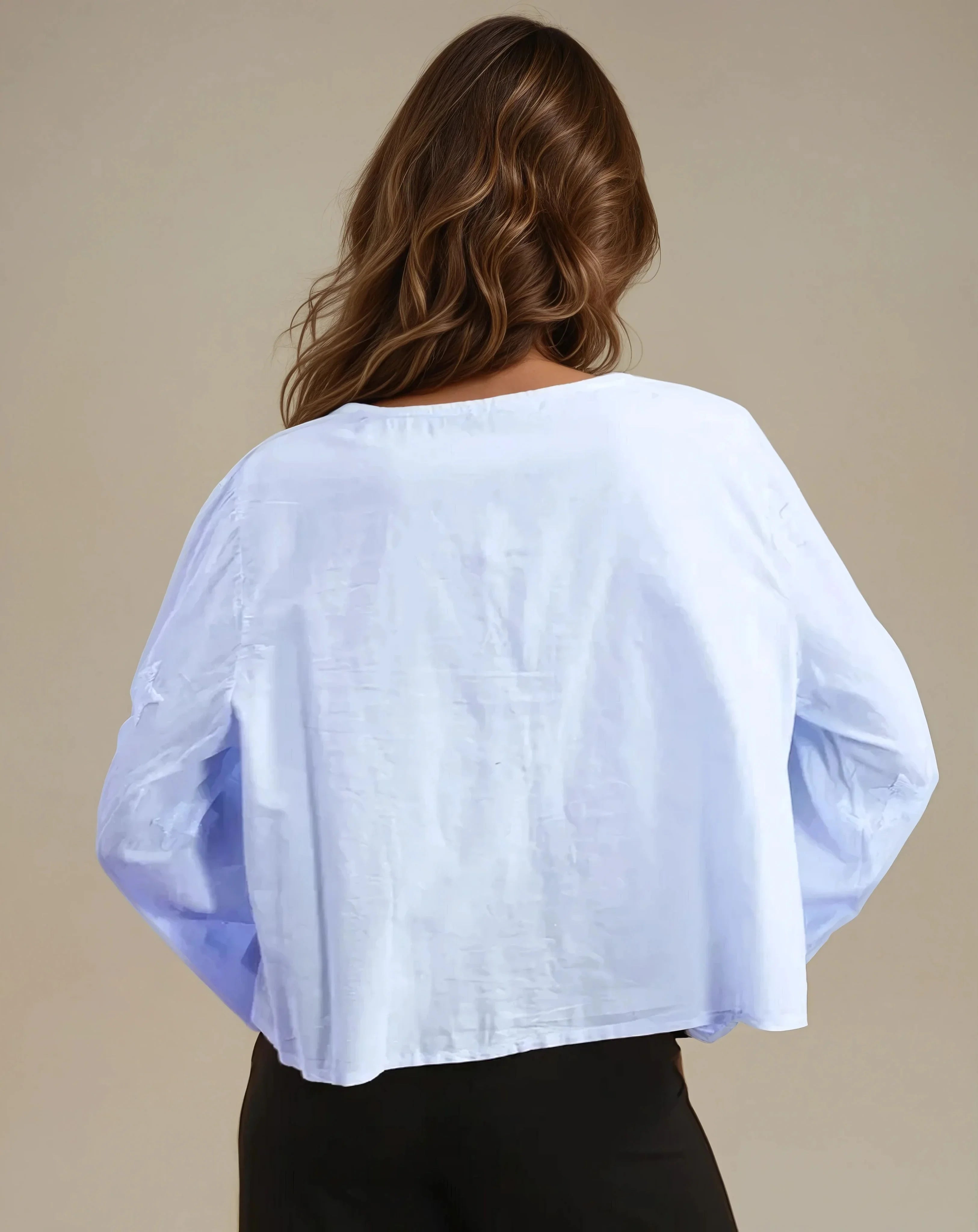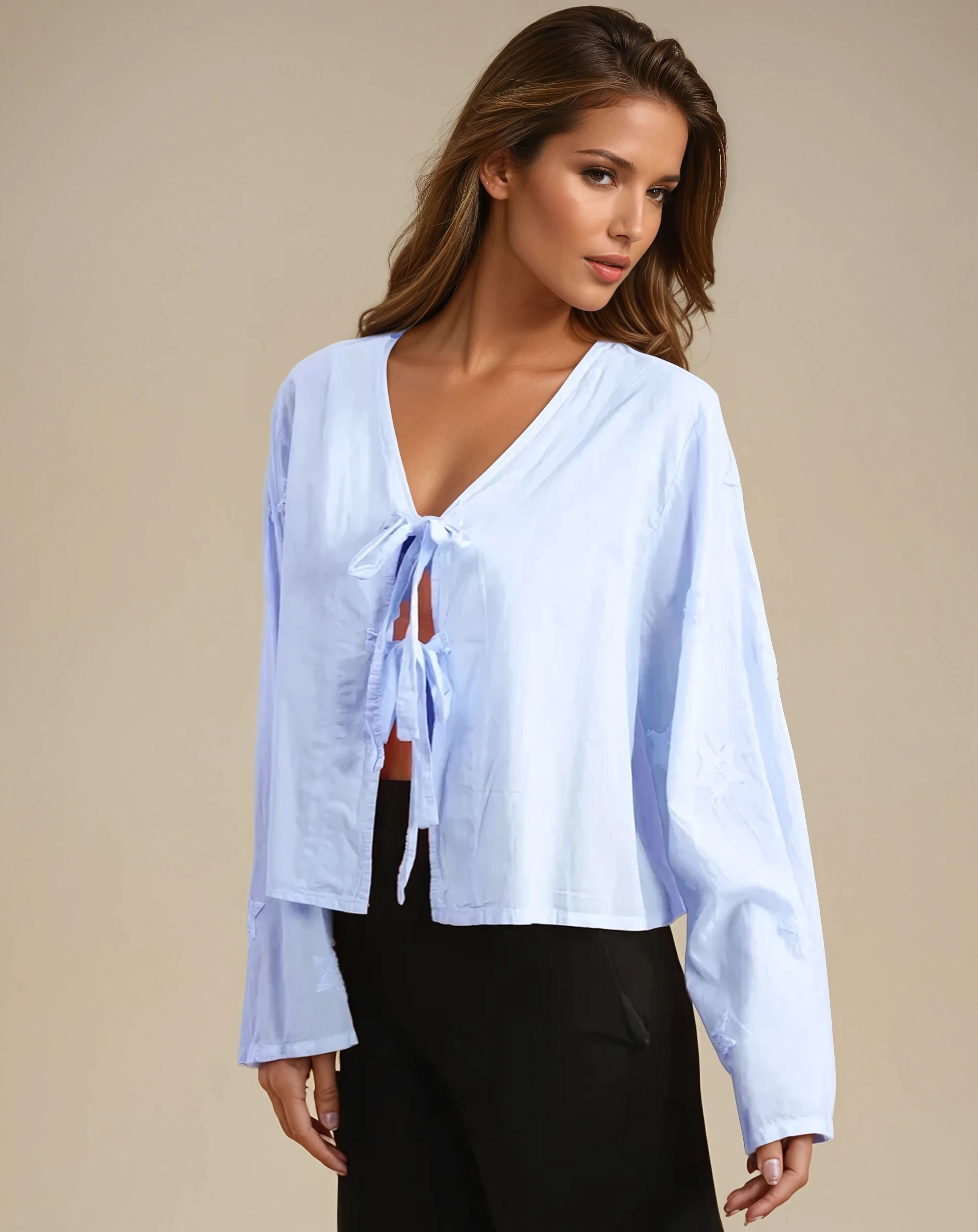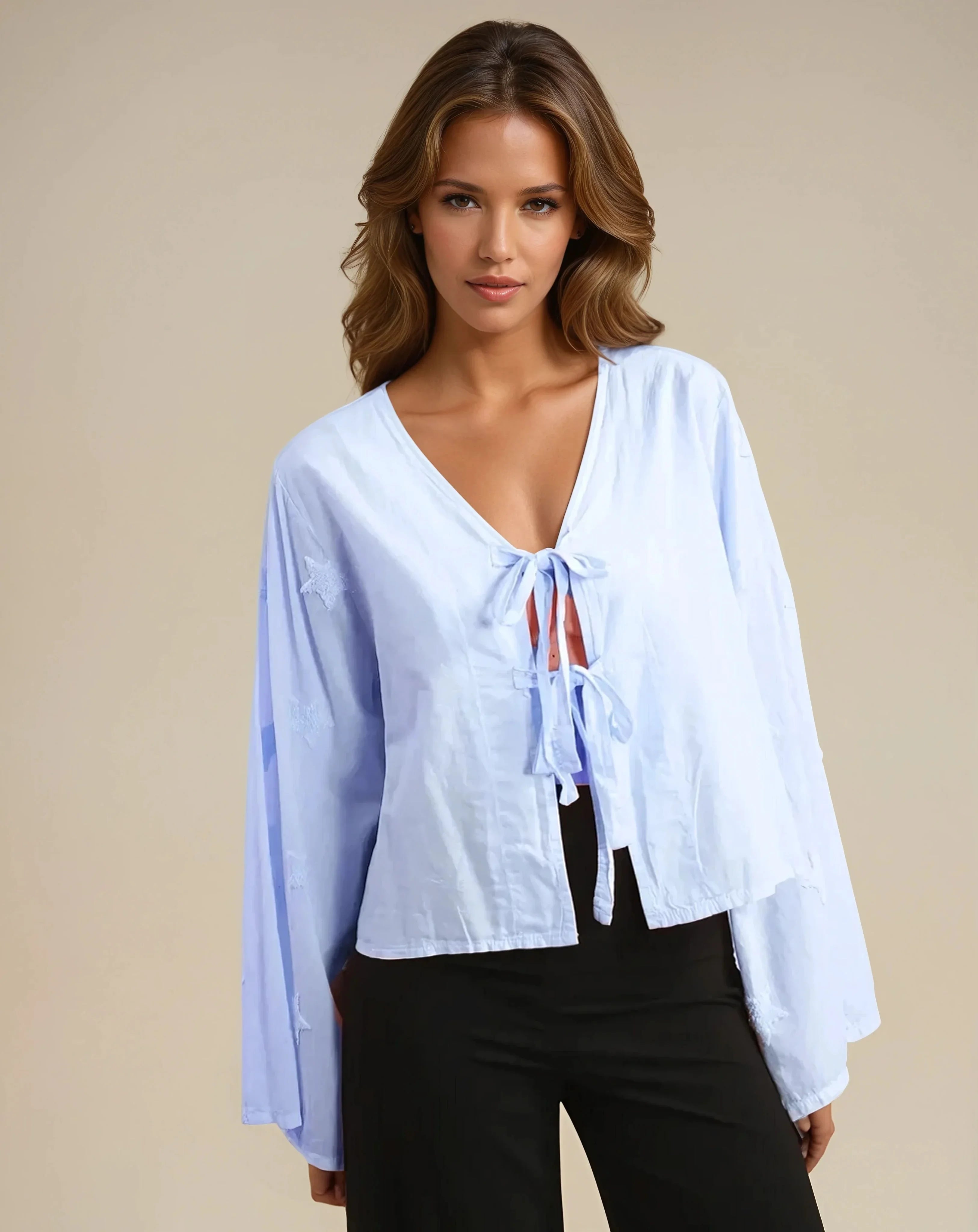 En romantisk och luftig blus som fångar den perfekta bohemiska känslan. Den djupa V-ringningen pryds av vackra knytband framtill, vilket skapar en feminin och justerbar passform. De långa, vida ärmarna ger ett elegant fall, medan stjärnformade broderier tillför karaktär och textur. Den asymmetriska fållen förstärker blusens moderna och luftiga uttryck.