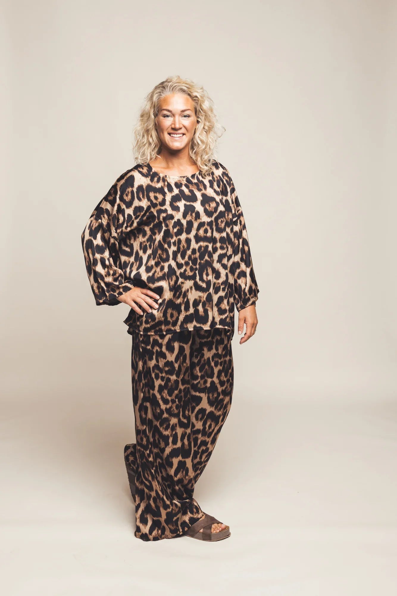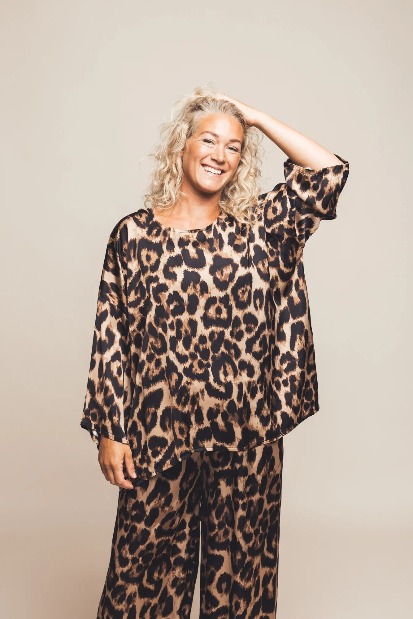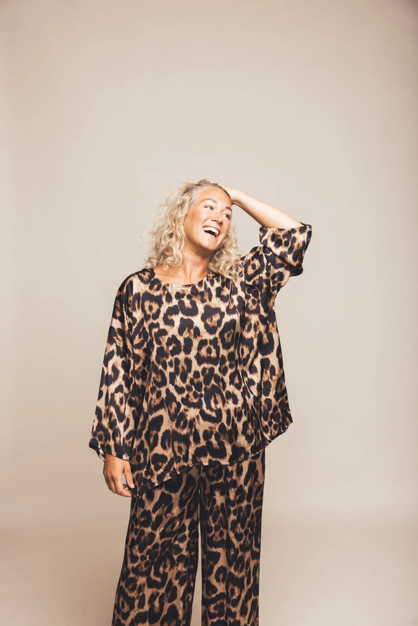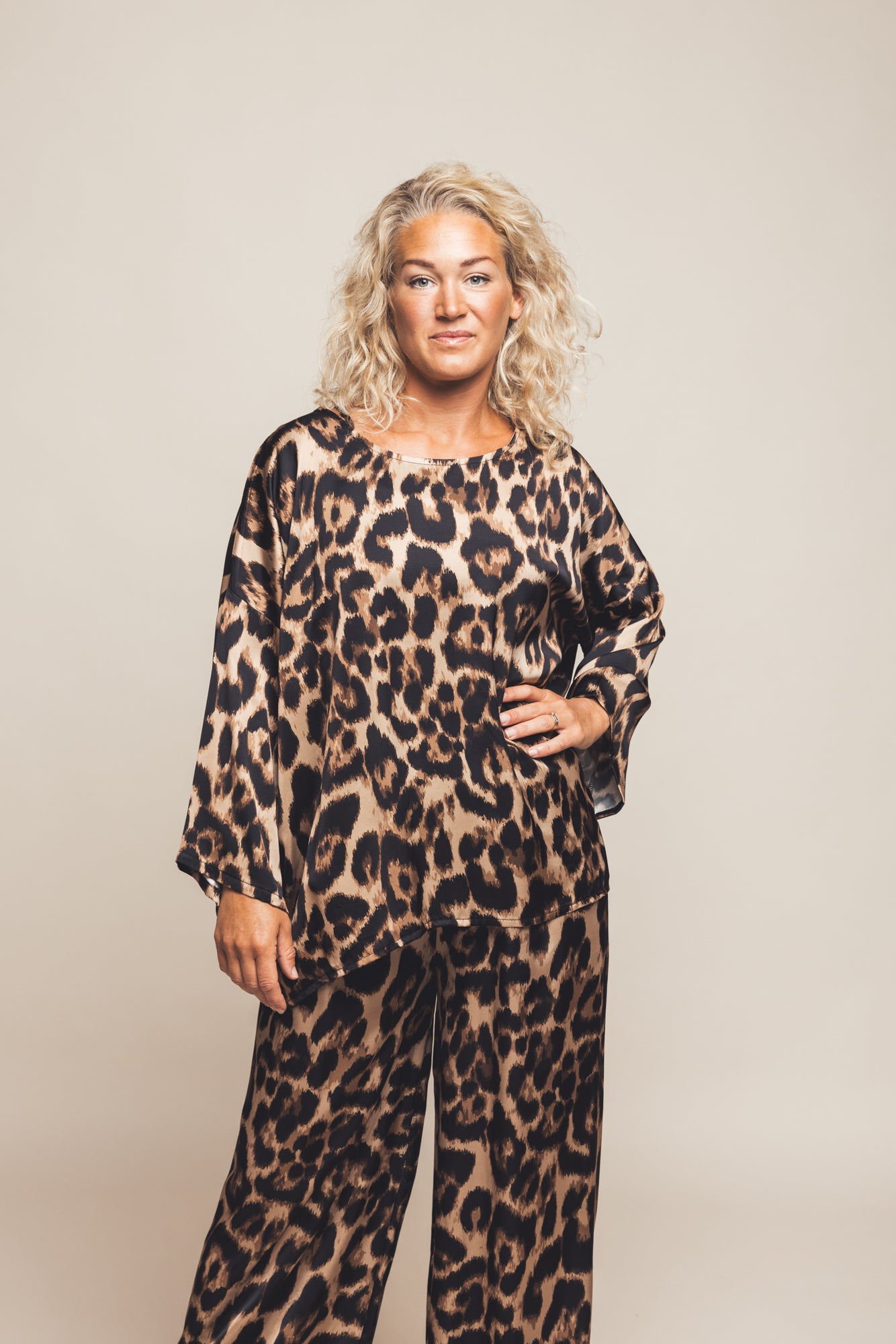 Det första som fångar ögat är det tuffa leopardmönstret som pryder tunikan och som ger den en tuff men samtidigt feminin touch. Blusen har lång ärm och har ingen knäppning.
