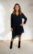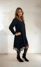 Stilren och feminin med vackra spetsdetaljer ✨ Klänning Maja från Mirelle Design är en elegant klänning i svart med asymmetrisk fåll och dekorativ spetskant som ger en mjuk och klädsam silhuett. Den diskreta V-ringningen framtill pryds av spets för en romantisk touch, medan den lediga passformen gör klänningen både bekväm och smickrande.