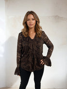 Blusen kommer i fyra färger – mörkröd, brun, vit och svart – och är tillverkad i ett lätt stretchigt spetsmaterial för skön passform och rörelsefrihet.