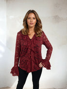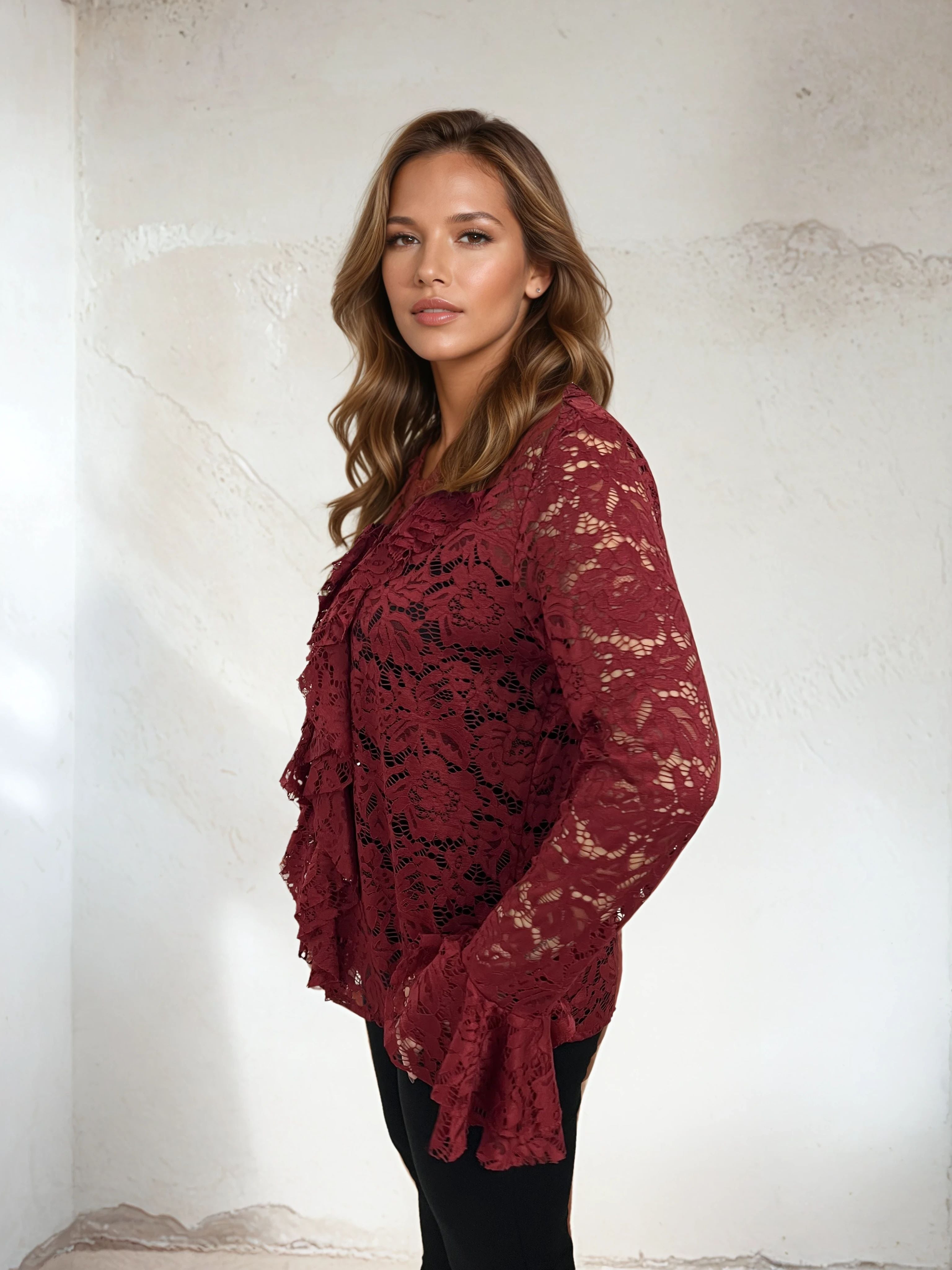 Blusen kommer i fyra färger – mörkröd, brun, vit och svart – och är tillverkad i ett lätt stretchigt spetsmaterial för skön passform och rörelsefrihet.
