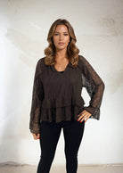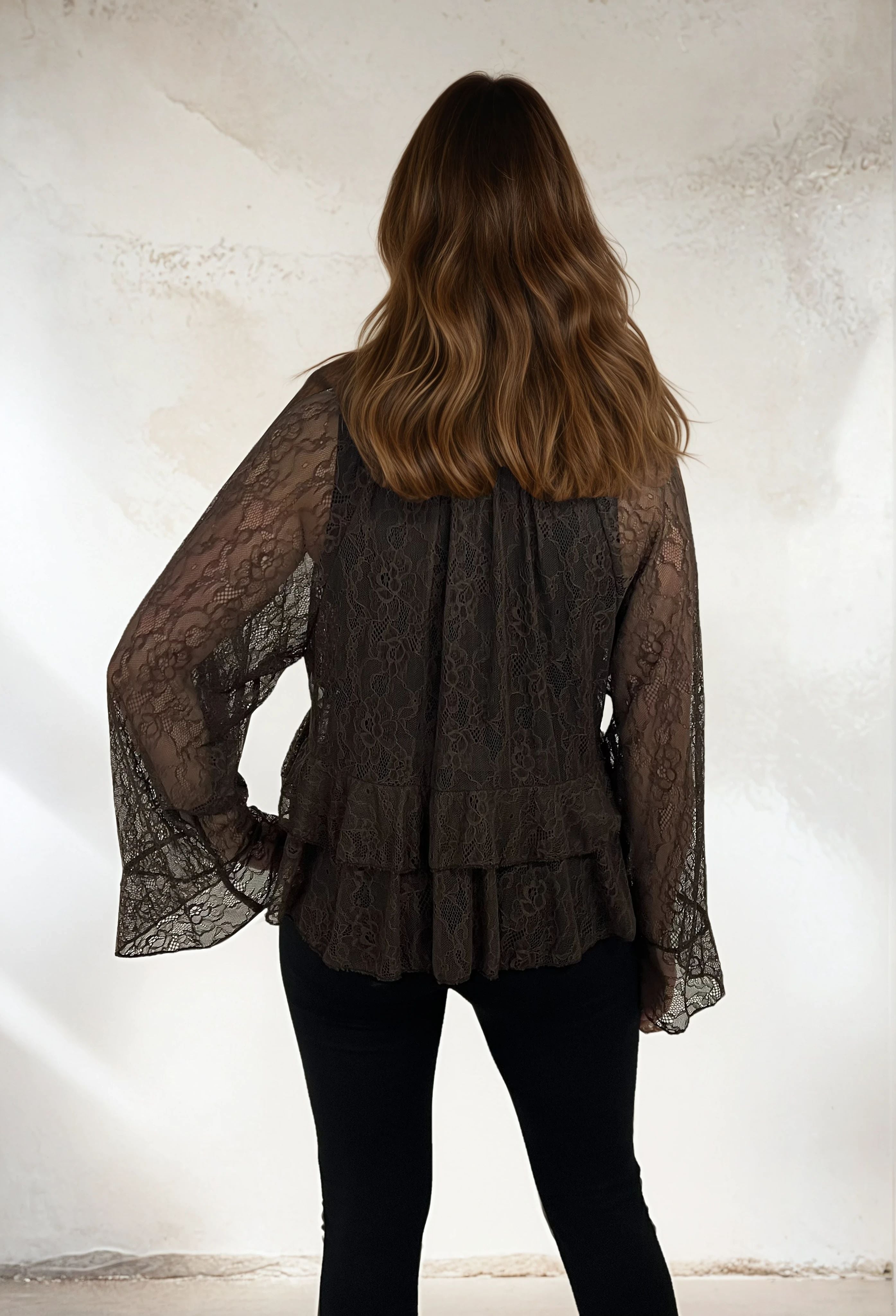 Elegant och tidlös spetsblus från vårt eget märke Mirelle Design, tillverkad i Italien. Blusen har en vacker, feminin design med lätt utställda ärmar och dubbla volanger nertill som ger ett mjukt fall och en romantisk känsla. Det genombrutna spetsmaterialet gör den både luftig och elegant – perfekt för både vardag och fest.
