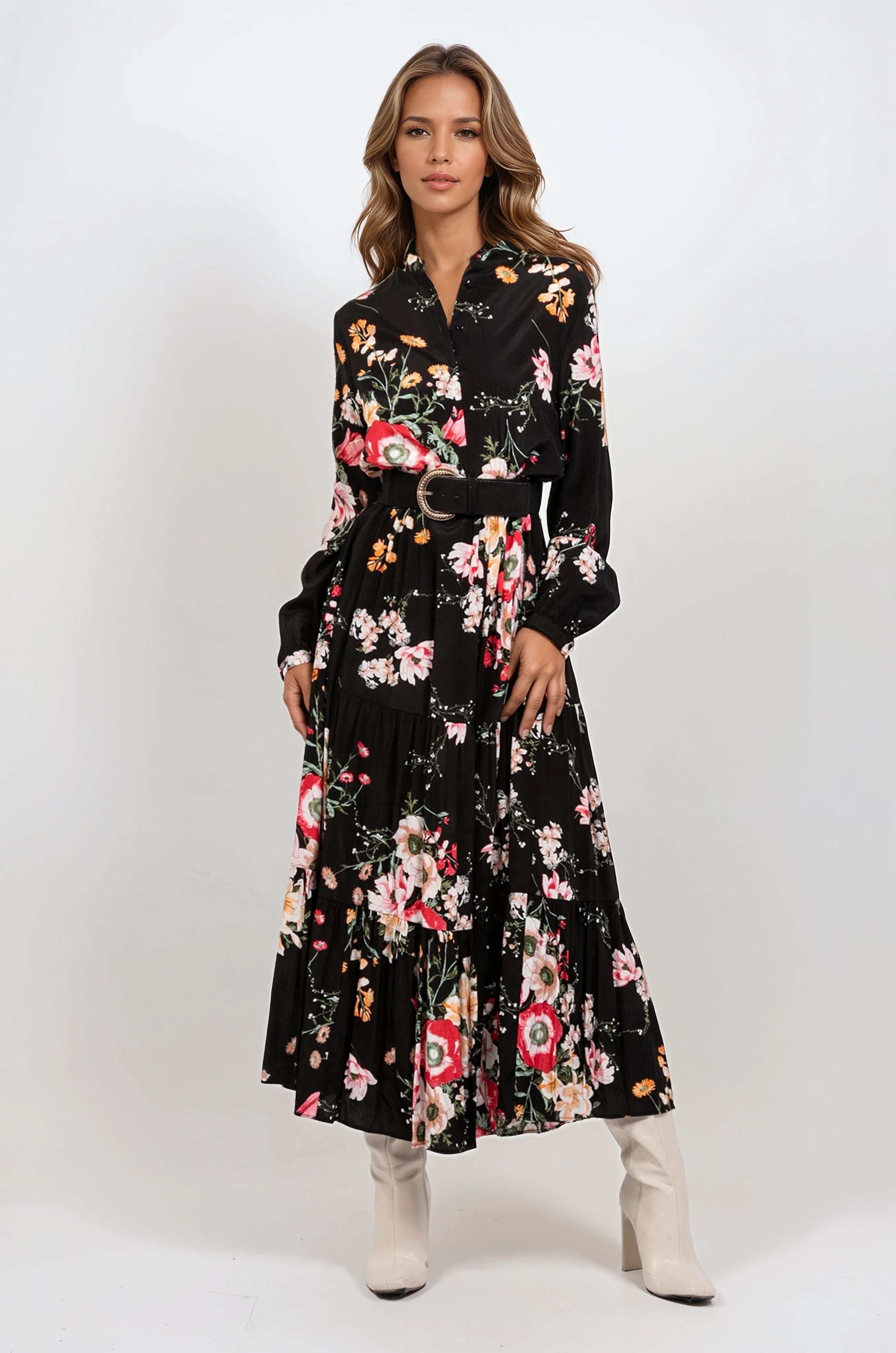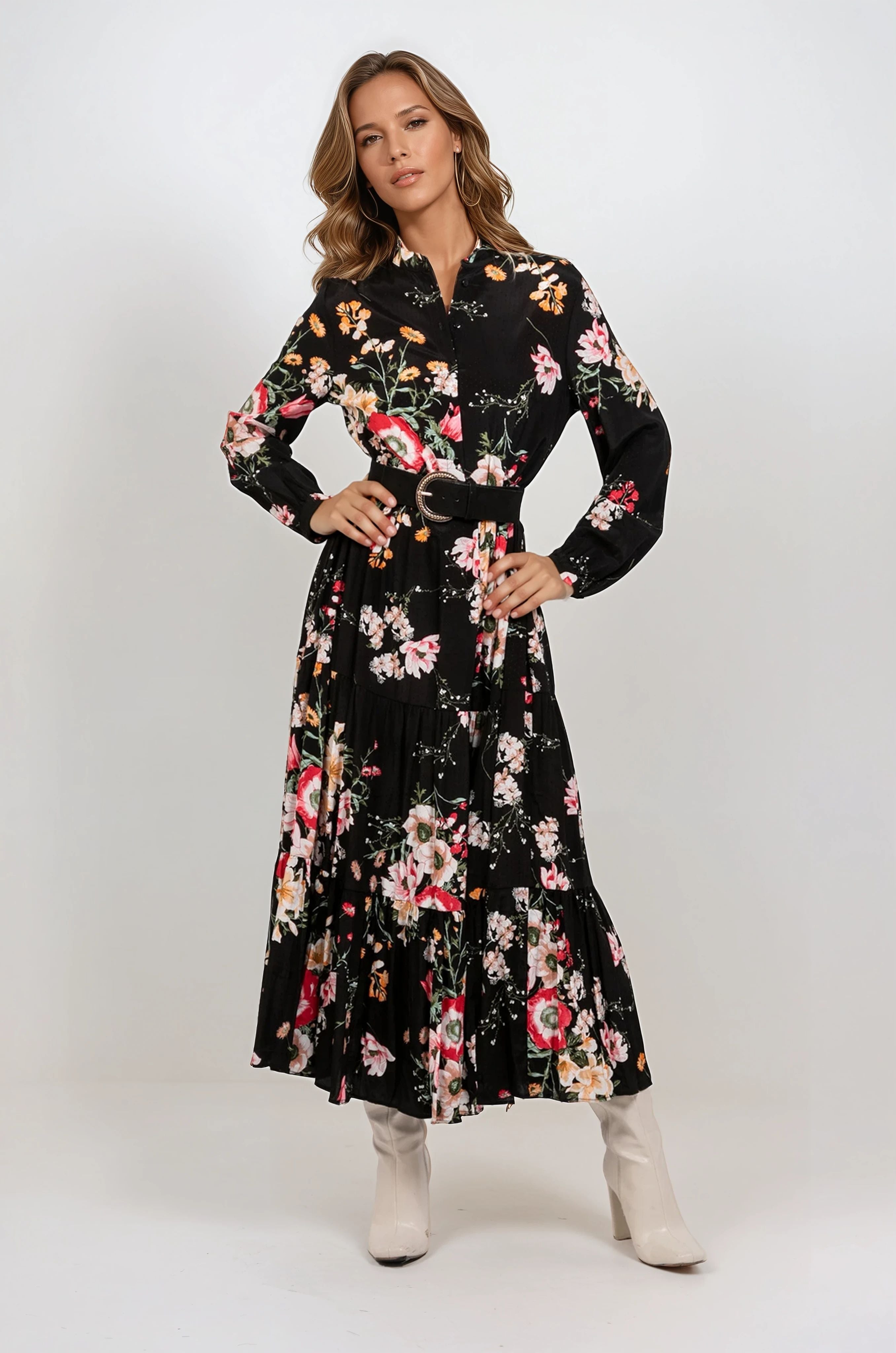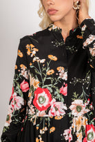 Klänning Blomster är en lång skjortklänning med ett färgstarkt, romantiskt blommönster på svart botten – en riktig statement-klänning som ändå känns enkel att bära. Den tvättade finishen ger ett mjukt och avslappnat uttryck, medan V-ringningen med knappar framtill och den utsvängda passformen skapar ett vackert fall. Den rynkade nederdelen ger extra rörelse och en feminin siluett som passar lika fint med boots som med klackar.