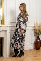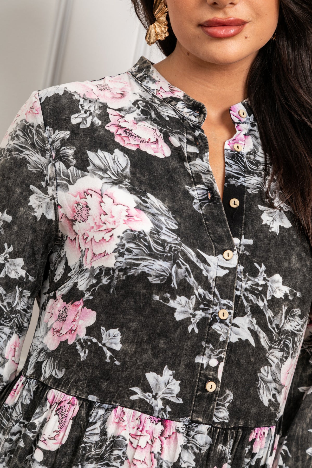 Klänning Roses är en lång skjortklänning med romantiskt rosprint i rosa och grå toner mot en svart, tvättad botten som ger en snyggt “vintage-washed” känsla. Den feminina V-ringningen med knappar framtill och den lätt utsvängda passformen skapar ett vackert fall och en siluett som känns både avslappnad och elegant. Perfekt att bära som den är med boots – eller styla med skärp i midjan för en mer markerad look.
