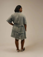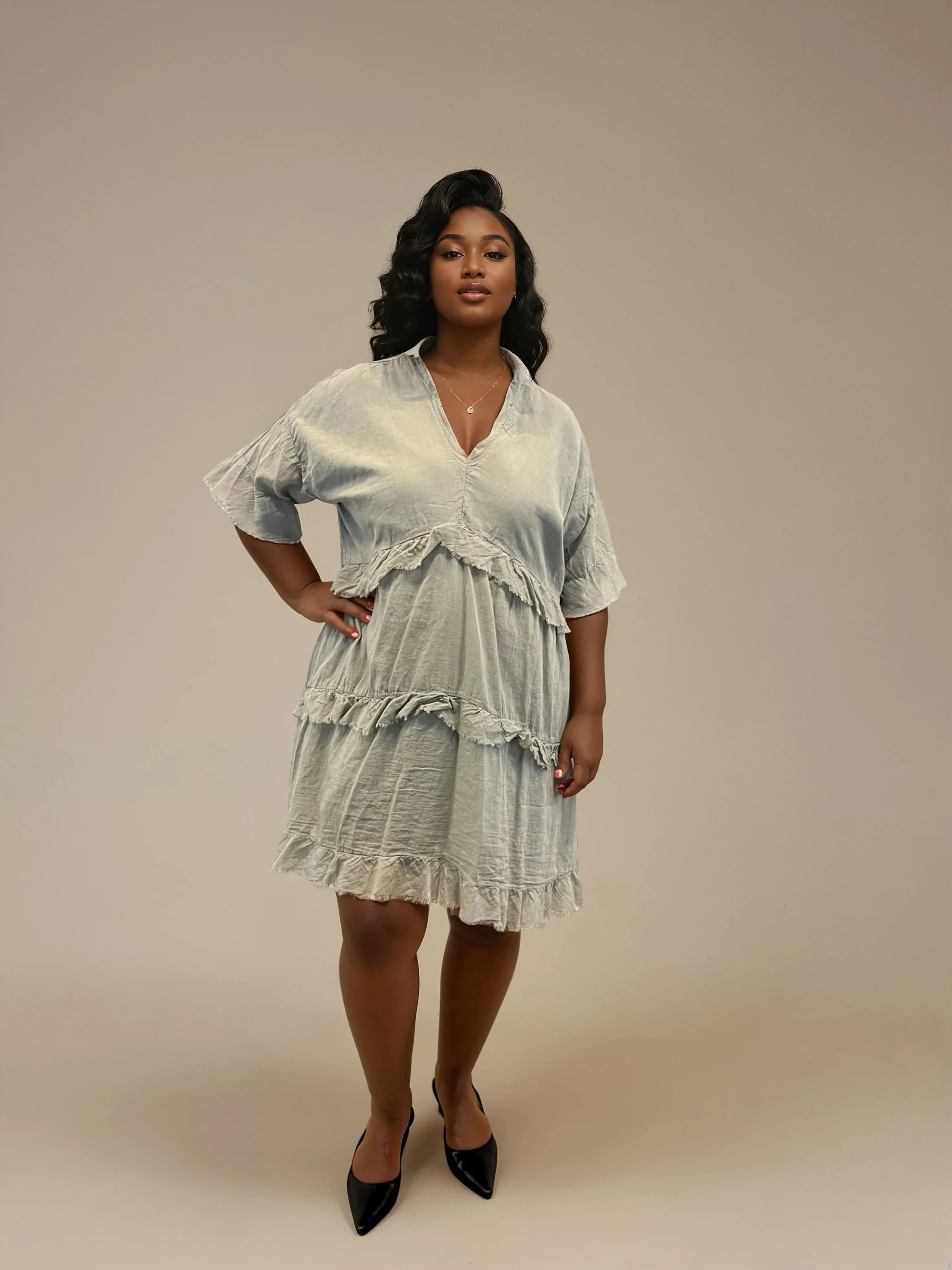 Tunikans design utmärker sig med volanger med franskant på flera ställen: längs halsringningen, vid 3/4-ärmarna samt framtill och baktill – vilket skapar en levande och romantisk siluett. Modellen är knälång framtill och något längre bak, för en luftig och smickrande form.