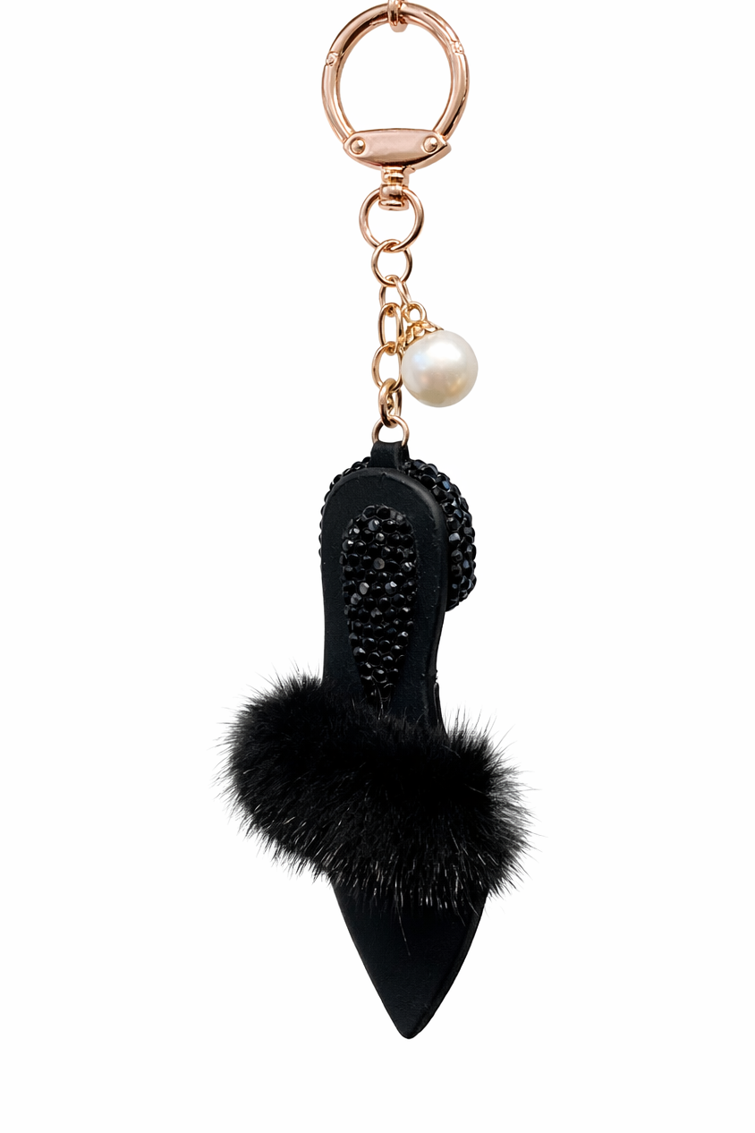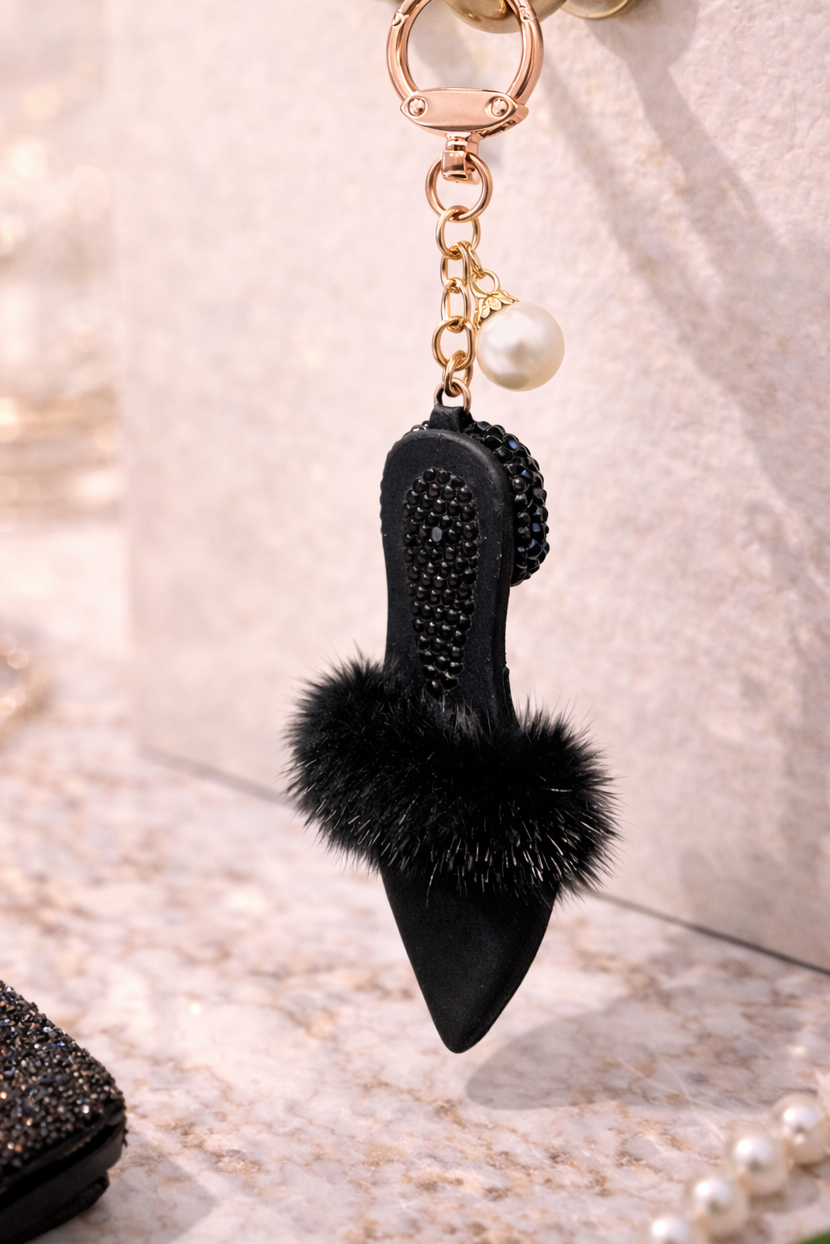 En exklusiv och feminin nyckelring i form av en elegant högklackad sko, dekorerad med gnistrande strassdetaljer och mjuk fuskpäls. Denna stilfulla accessoar är perfekt som väsksmycke eller nyckelsmycke och ger en lyxig touch till både handväska och nyckelknippa.