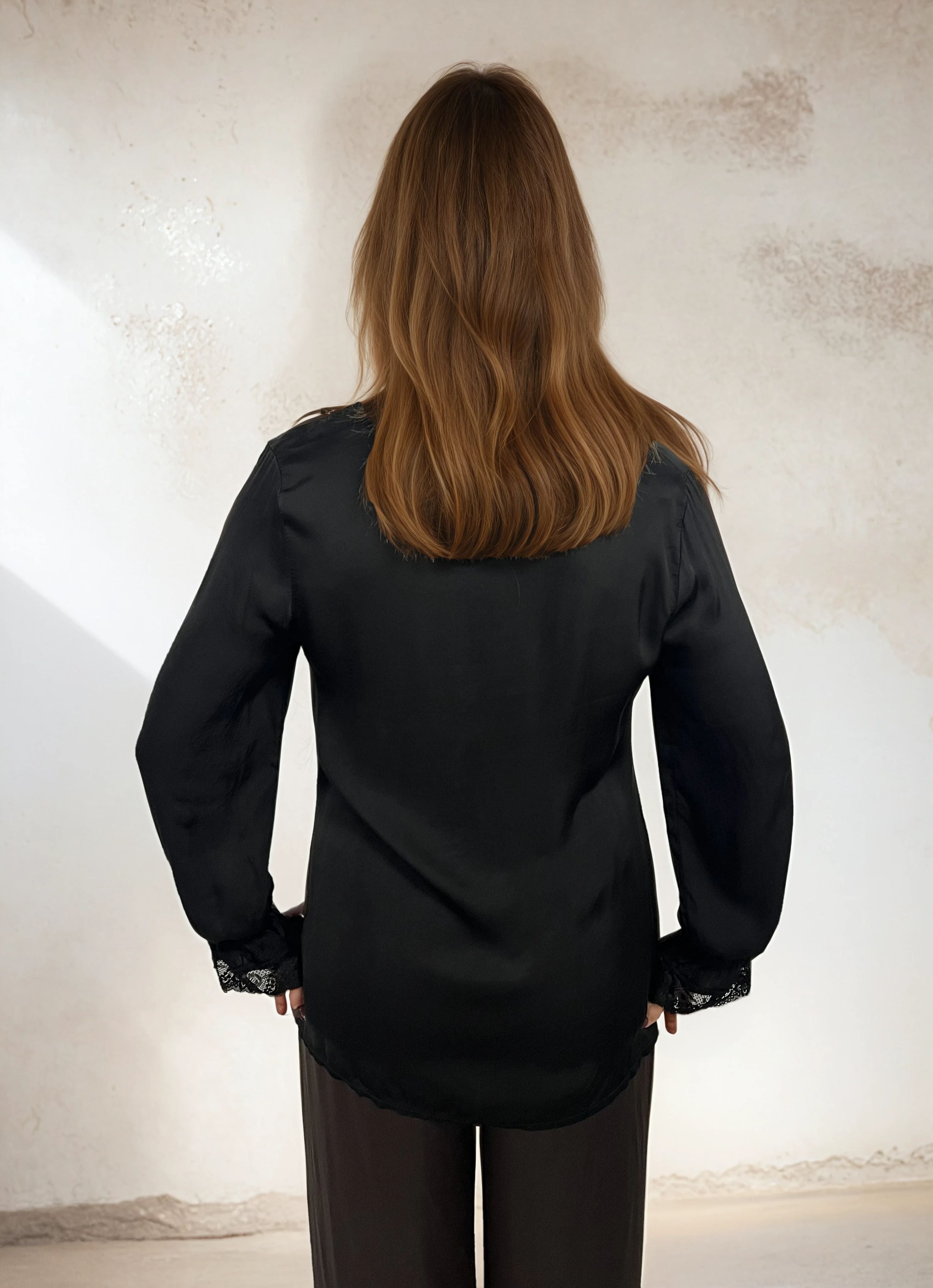Blus Hilda från Mirelle Design är en luftig och stilfull blus i 100 % viskos, prydd med vackra spetsdetaljer som ger en mjuk och romantisk känsla. Den v-ringade halsringningen och spets vid ärmsluten skapar en sofistikerad look – perfekt både till vardag och fest.