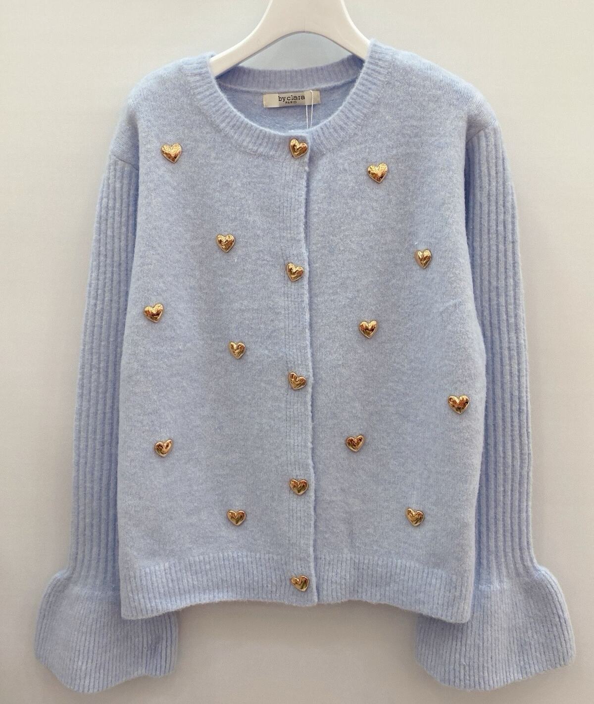En mjuk och romantisk cardigan i ljusblå nyans som ger din outfit en elegant och feminin touch. Den runda halsringningen och de dekorativa guldhjärtana framtill skapar ett exklusivt uttryck, medan de ribbade ärmsluten ger både komfort och en trendig silhuett. Cardiganen är stickad i ett följsamt och behagligt material som gör den perfekt att bära både till vardags och vid mer uppklädda tillfällen.