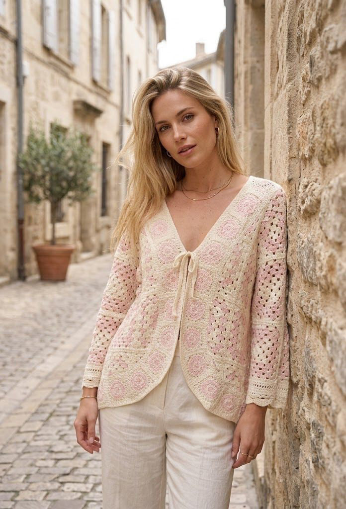 En romantisk och tidlös cardigan i vackert virkat mönster med klassiska mormorsrutor i mjuka rosa toner. Den luftiga designen i 100% bomull ger en lätt och behaglig känsla som passar perfekt under vår och sommar.