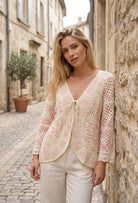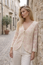 Cardiganen har en feminin V-ringning och knyts framtill med ett diskret band, vilket ger en avslappnad men elegant silhuett. Det handgjorda uttrycket tillsammans med de fina virkade detaljerna skapar en unik och bohemisk känsla.