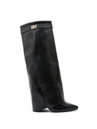 Tillverkade i slätt, mjukt syntetiskt läder som både ser lyxigt ut och känns bekvämt. Det dekorativa guldspännet vid skaftets överkant ger en exklusiv touch som kompletterar stövelns minimalistiska men kraftfulla form. Den spetsiga tån och den dolda klacken ger en smickrande, förlängande effekt på benet – perfekt till klänningar, kjolar eller ett par stilrena tights.
