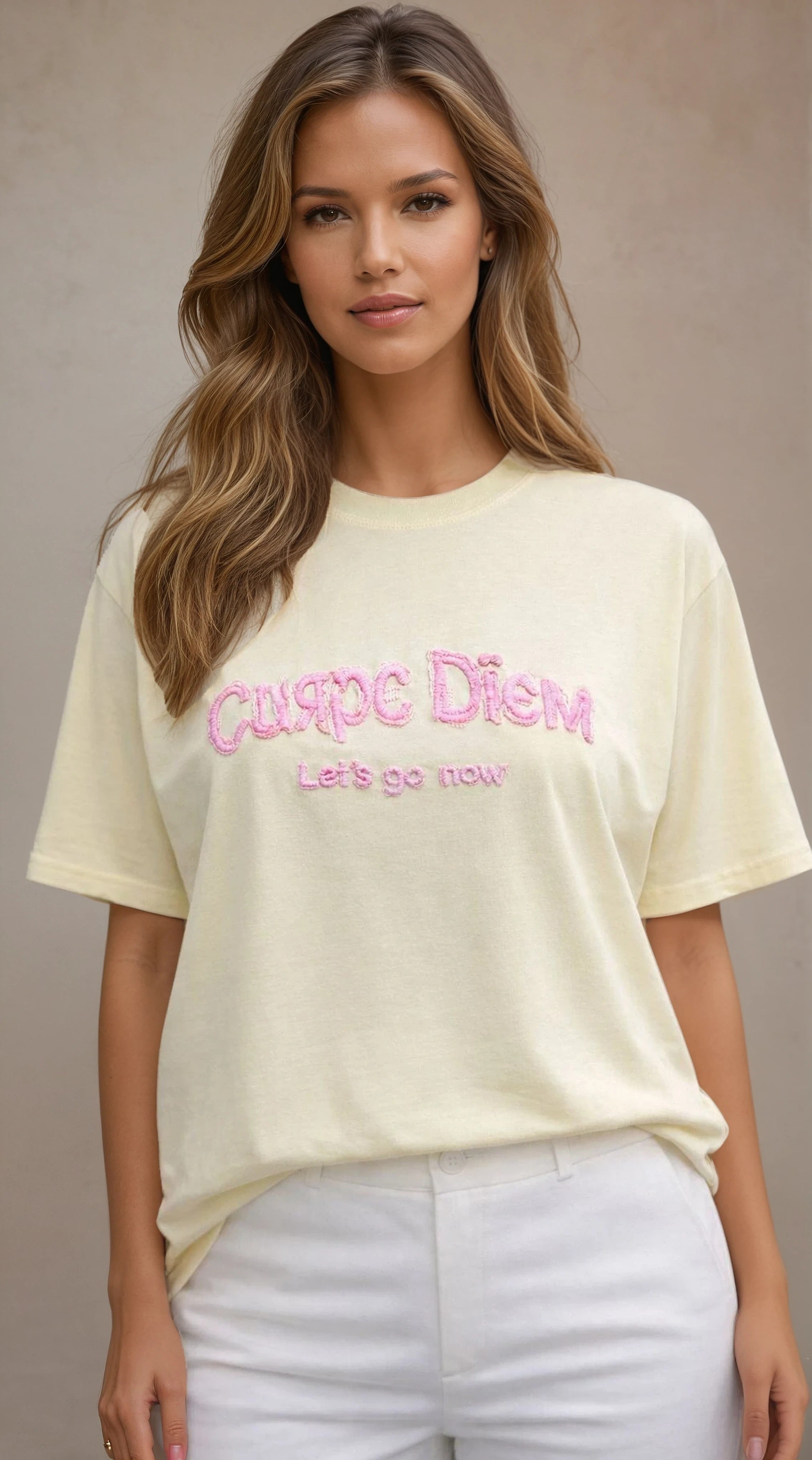 En stilren och bekväm t-shirt som kombinerar en avslappnad passform med ett inspirerande budskap. Den ljusblå färgen tillsammans med det broderade texttrycket “Carpe Diem – Let’s go now” ger plagget en modern och trendig look som passar perfekt i vardagsgarderoben.