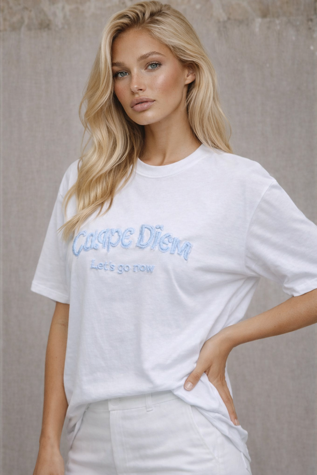 En stilren och bekväm t-shirt som kombinerar en avslappnad passform med ett inspirerande budskap. Den ljusblå färgen tillsammans med det broderade texttrycket “Carpe Diem – Let’s go now” ger plagget en modern och trendig look som passar perfekt i vardagsgarderoben.
