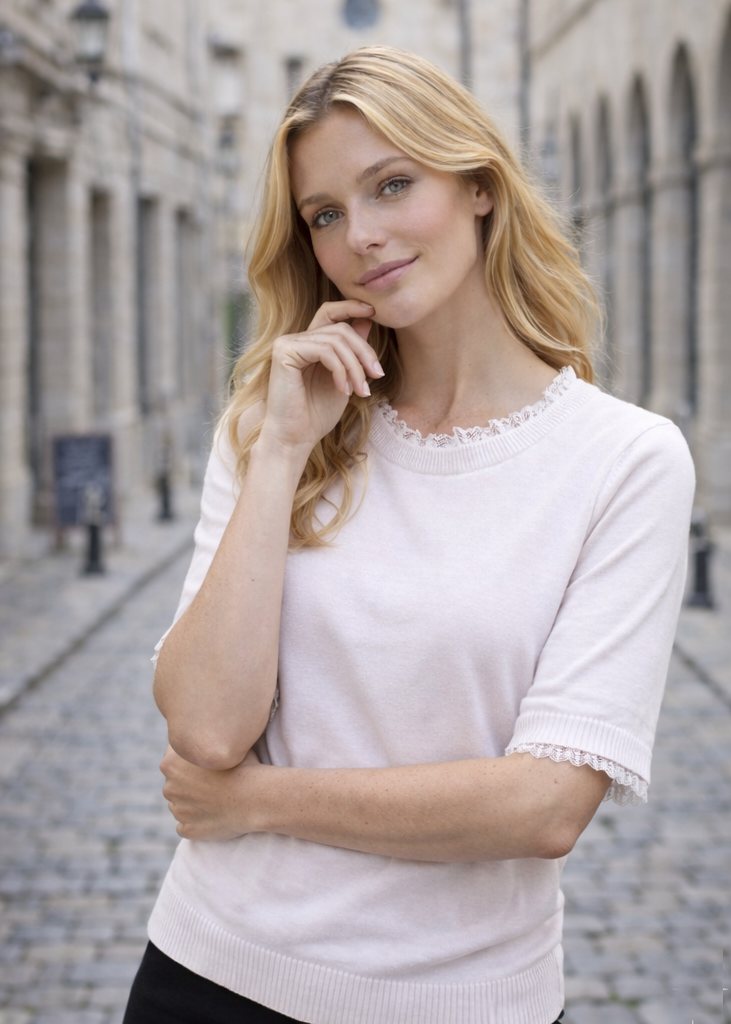 Spetsen syns elegant vid ringningen och i ärmsluten, vilket skapar en romantisk och sofistikerad känsla. Perfekt att bära som den är eller under en kavaj, kofta eller jacka när du vill låta spetsen kika fram.