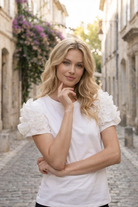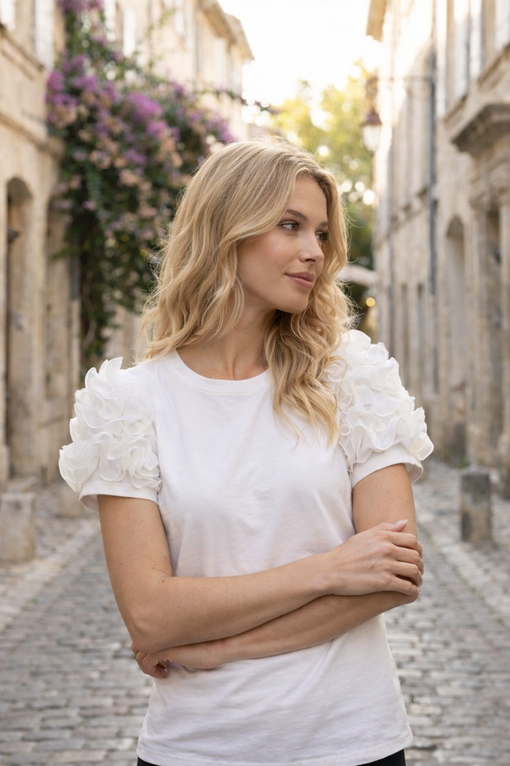 En stilren och feminin topp med vackra volangdetaljer på ärmarna som ger plagget ett elegant och modernt uttryck. Toppen är tillverkad i en mjuk och följsam bomullsblandning som känns skön mot huden och ger en bekväm passform hela dagen. Den klassiska rundade halsringningen och den enkla designen gör den lätt att matcha både till jeans för en avslappnad look eller till kjol och byxor för en mer uppklädd stil.