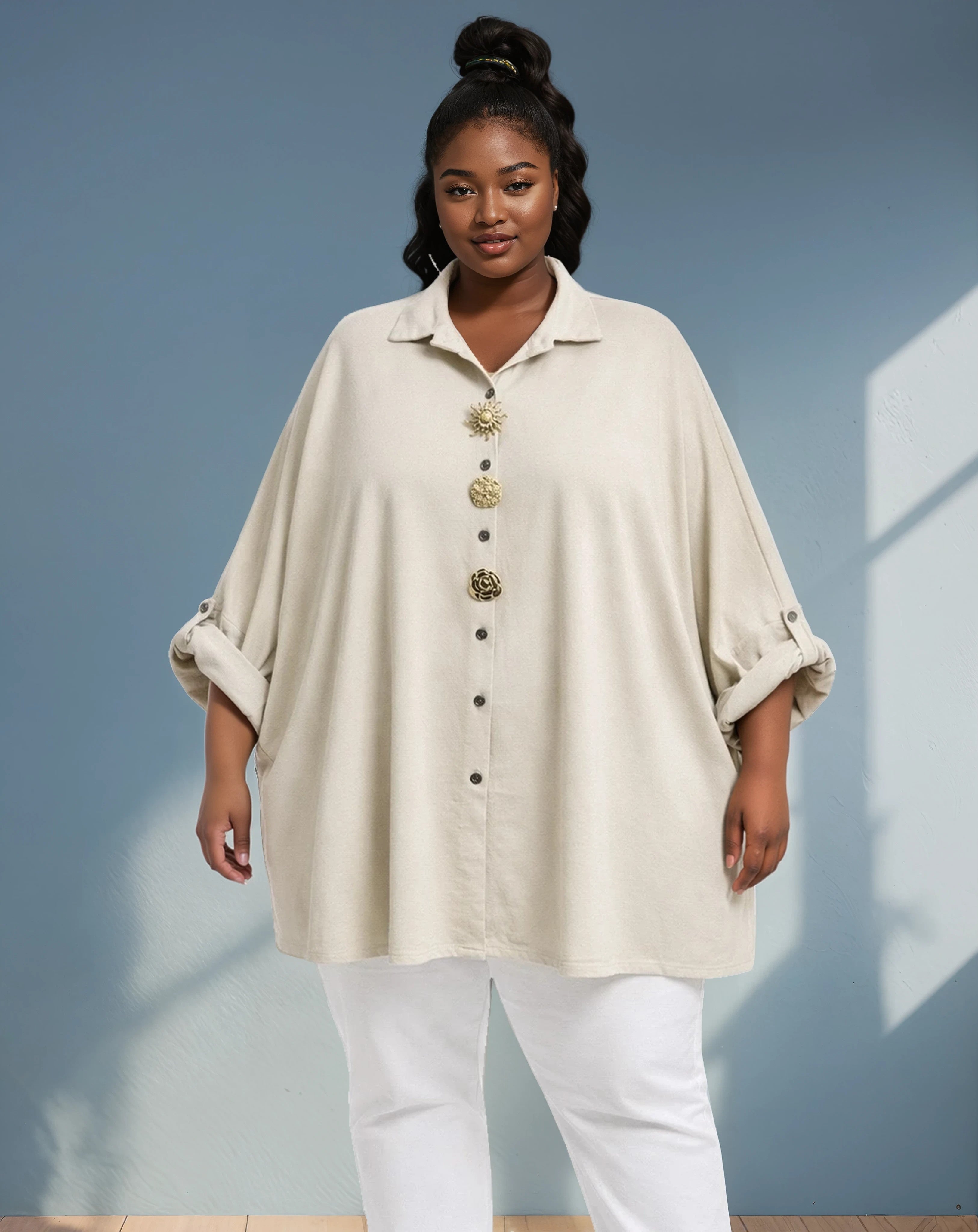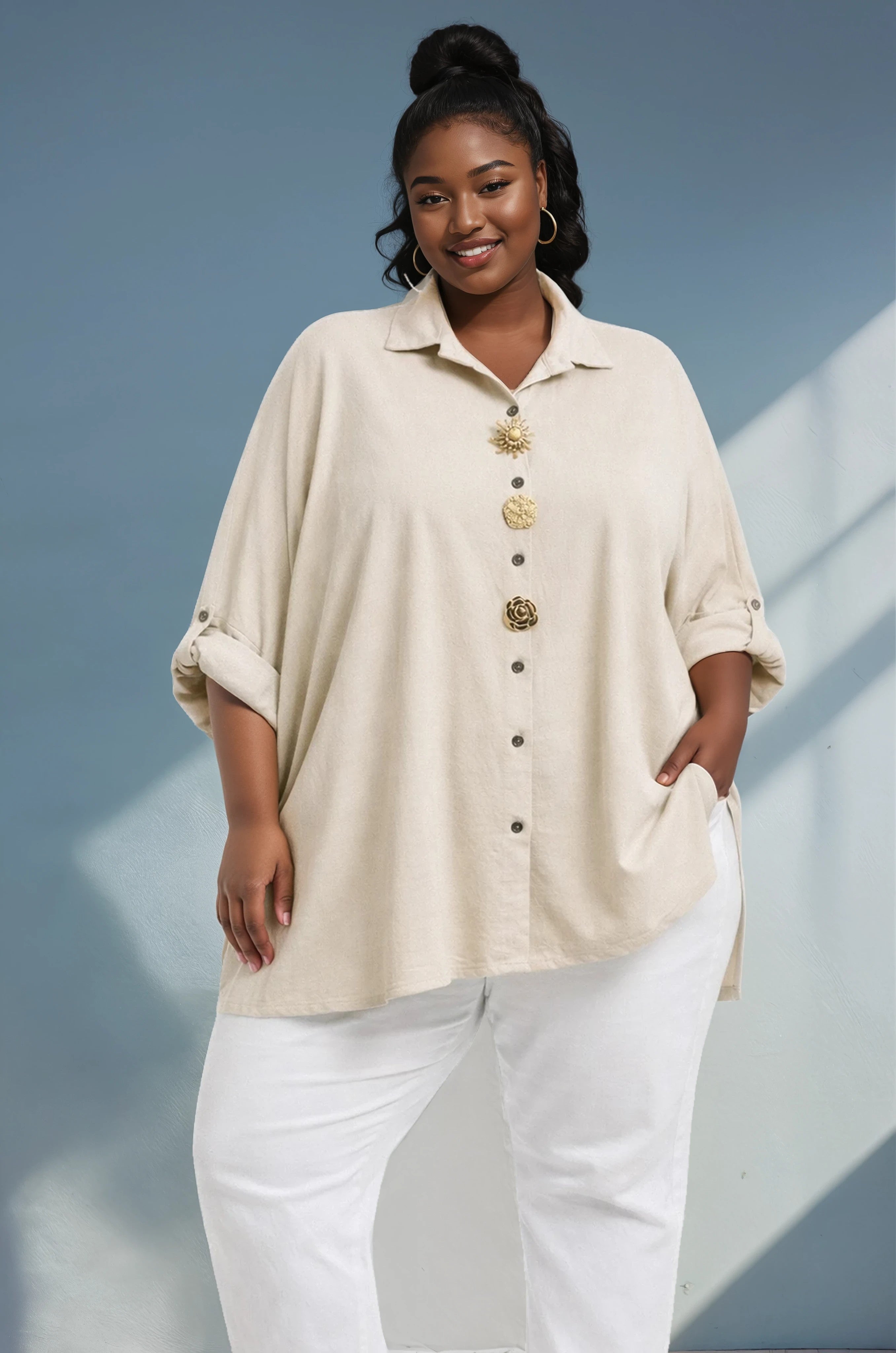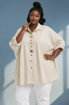 Blusen har klassisk krage och är genomknäppt framtill med dekorativa knappar som ger ett elegant uttryck. De vida ärmarna kan vikas upp och fästas med knapp för en mer avslappnad look. Den mjuka bomullskvaliteten med stretch gör den extra behaglig att bära hela dagen.