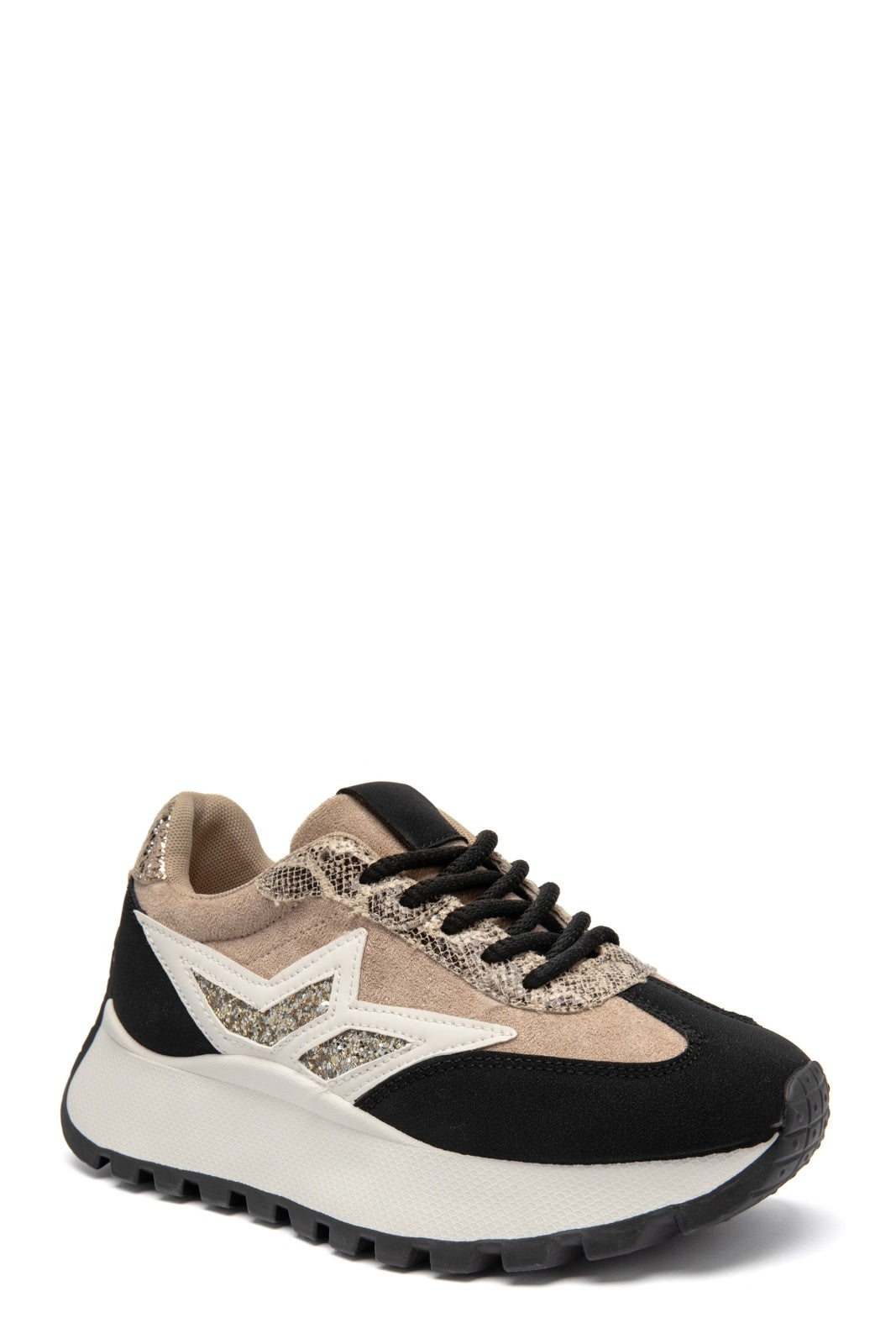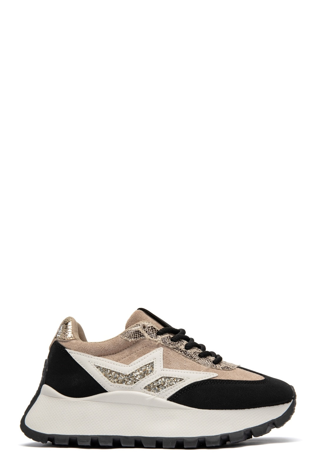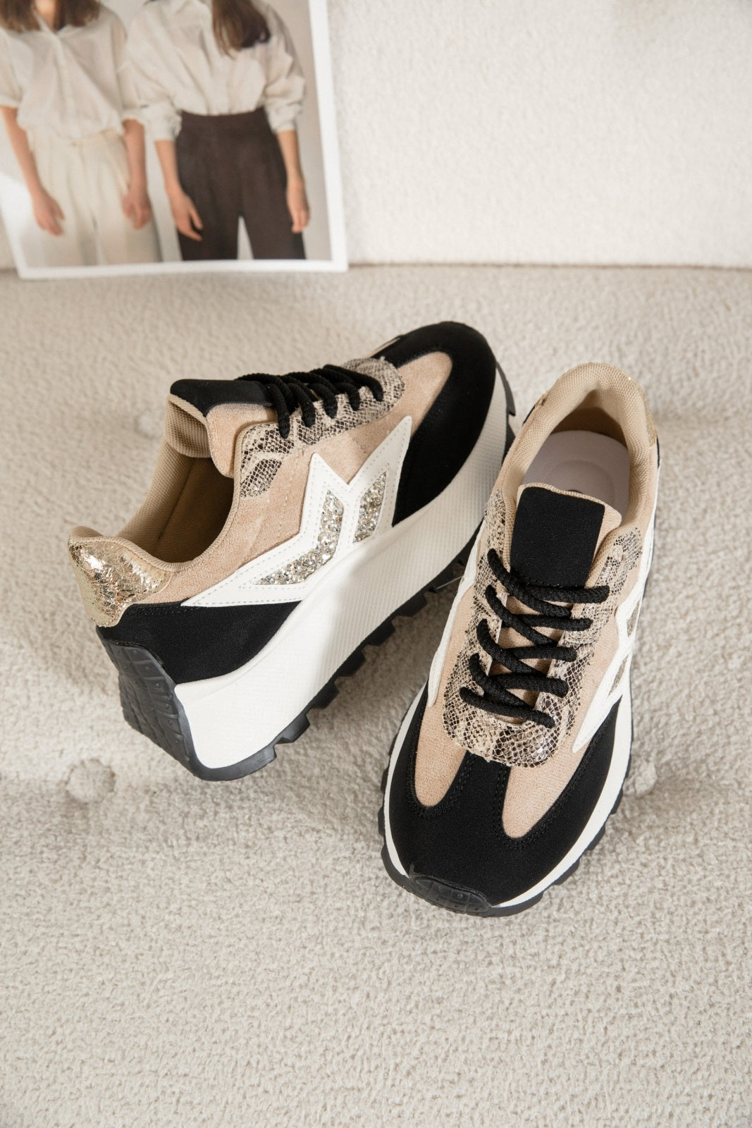 Designen blandar olika material och texturer för ett levande uttryck – från mjuka partier i mockaimitation till detaljer med lätt struktur och diskret glans. De kontrasterande inslagen och den kraftigare, mönstrade sulan ger en trendig och urban känsla.