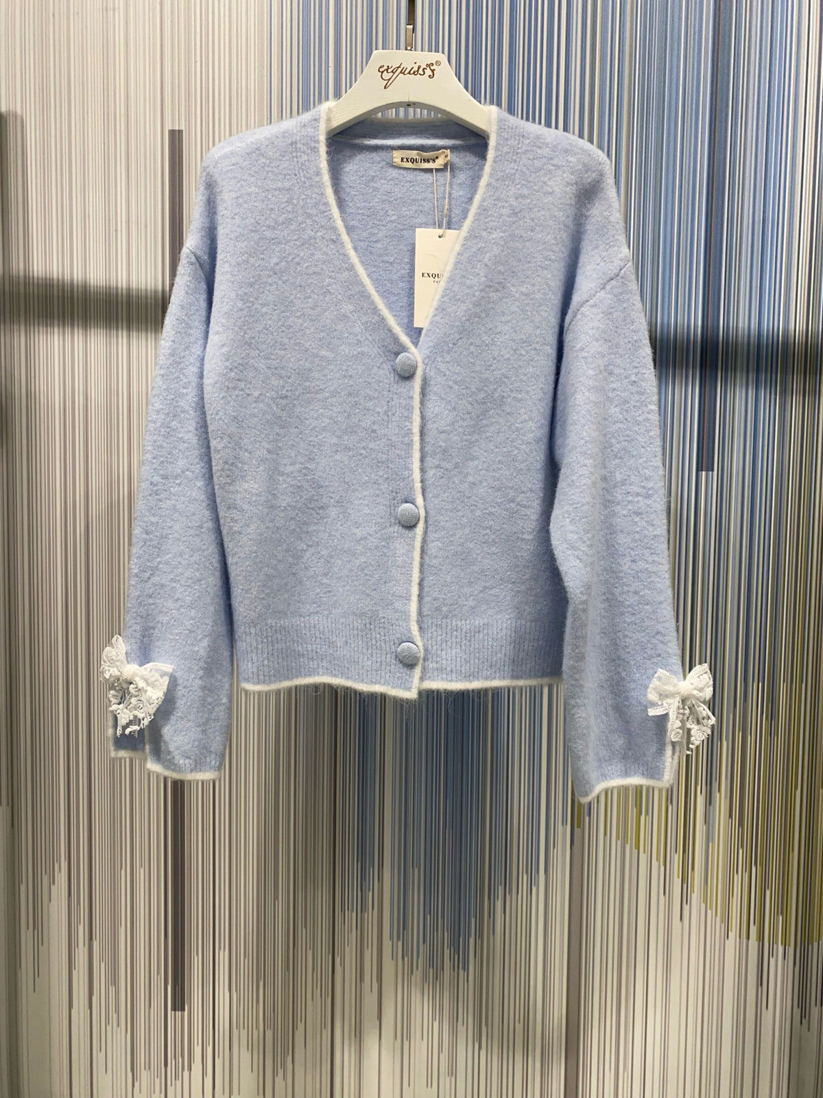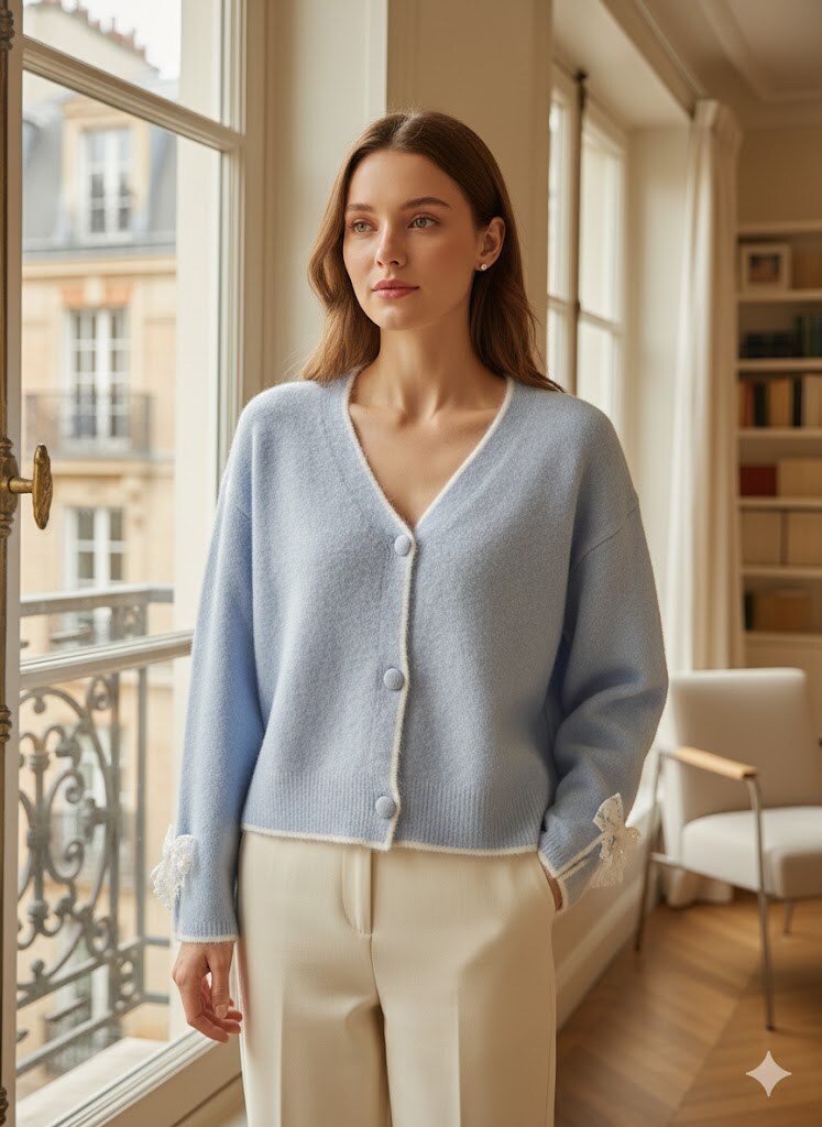 Mjuka dagar, snygga detaljer! Den här knappade cardiganen är stickad i en lätt, fluffig kvalitet som känns lika skön som den ser ut. Den V-ringade formen ramar in halsen fint och gör den enkel att bära både till jeans, kjol och klänning. Extra plus för de delikata spetsdetaljerna på ärmsluten som ger en feminin och modern touch – perfekt när du vill känna dig “uppklädd utan att anstränga dig”.
