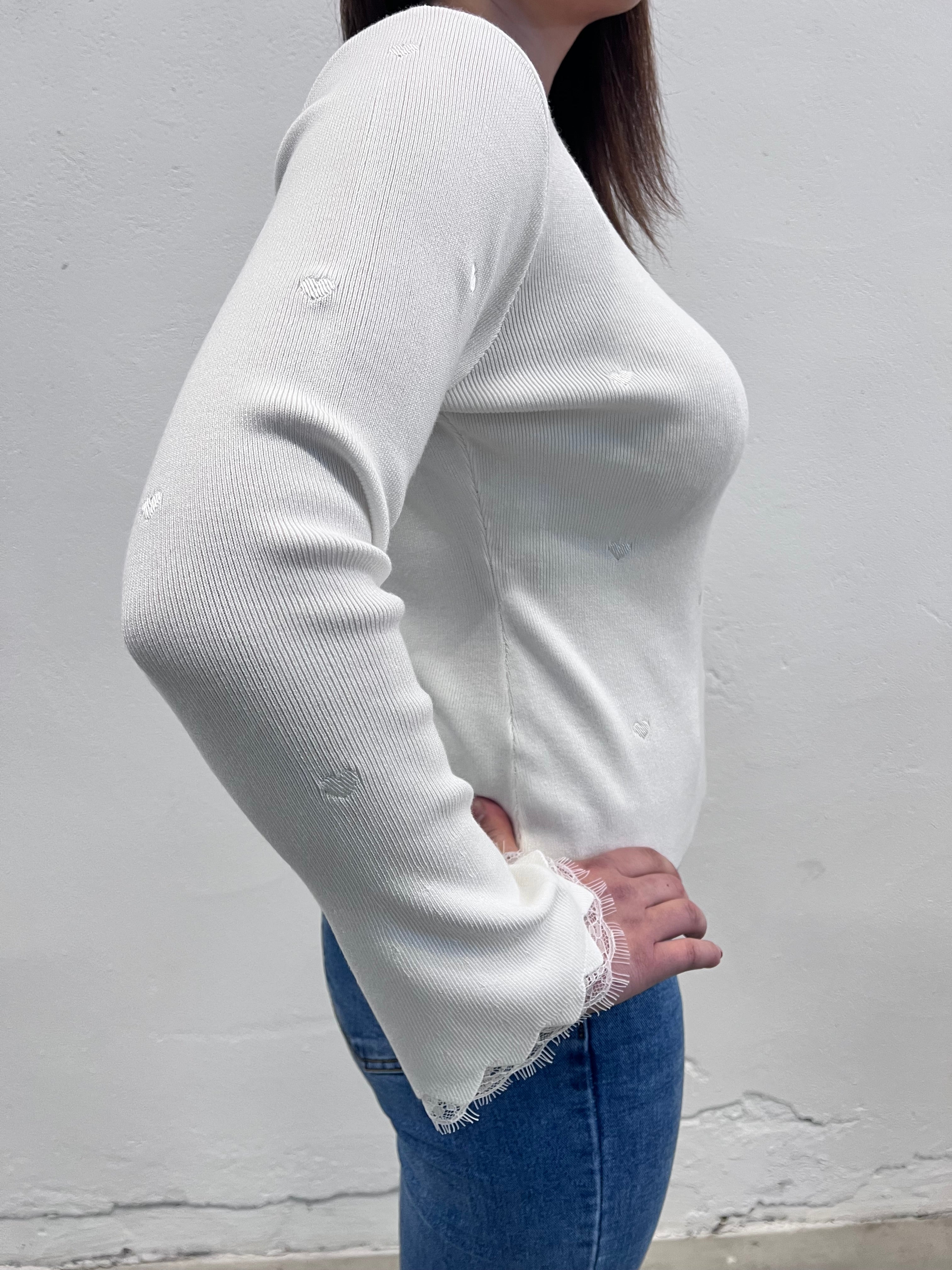En tidlös, mjuk och feminin tröja där de broderade hjärtana och spetsdetaljerna ger ett lyxigt men lekfullt uttryck. En perfekt bas med det lilla extra – lätt att bära året om.