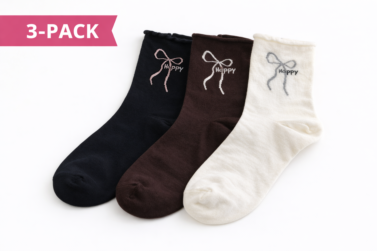 Ett stilrent 3-pack strumpor med söt rosett och textdetalj som ger din outfit det lilla extra. Perfekta för dig som vill kombinera komfort med en feminin och trendig touch.