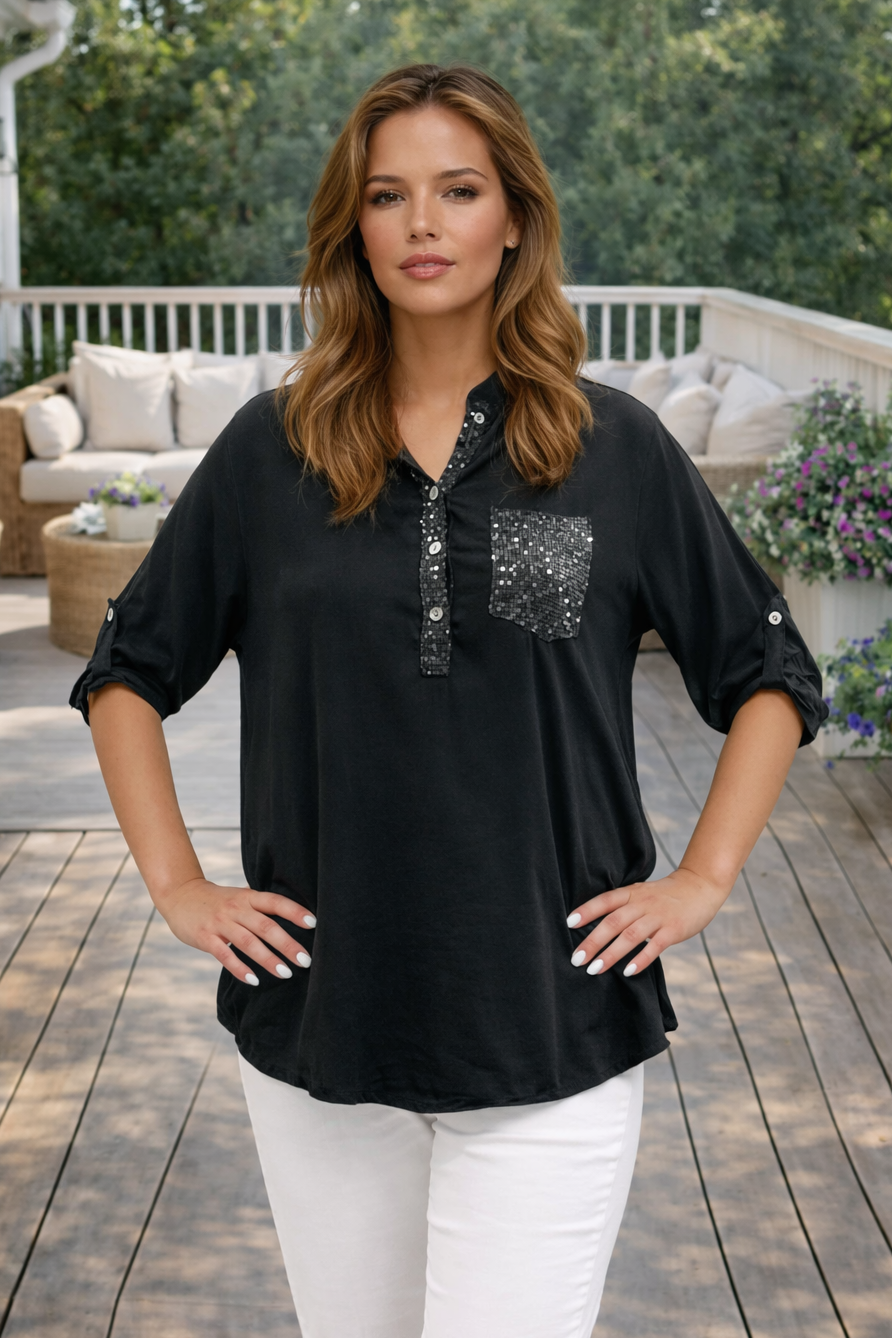 En alsidig favorit, der fungerer lige så godt for jeans til et afslappet hverdagslig look som for sorte bukser til en mere klædt følelse. De diskrete glittery detaljer løfter blusen og gør den også perfekt til mere festlige lejligheder.