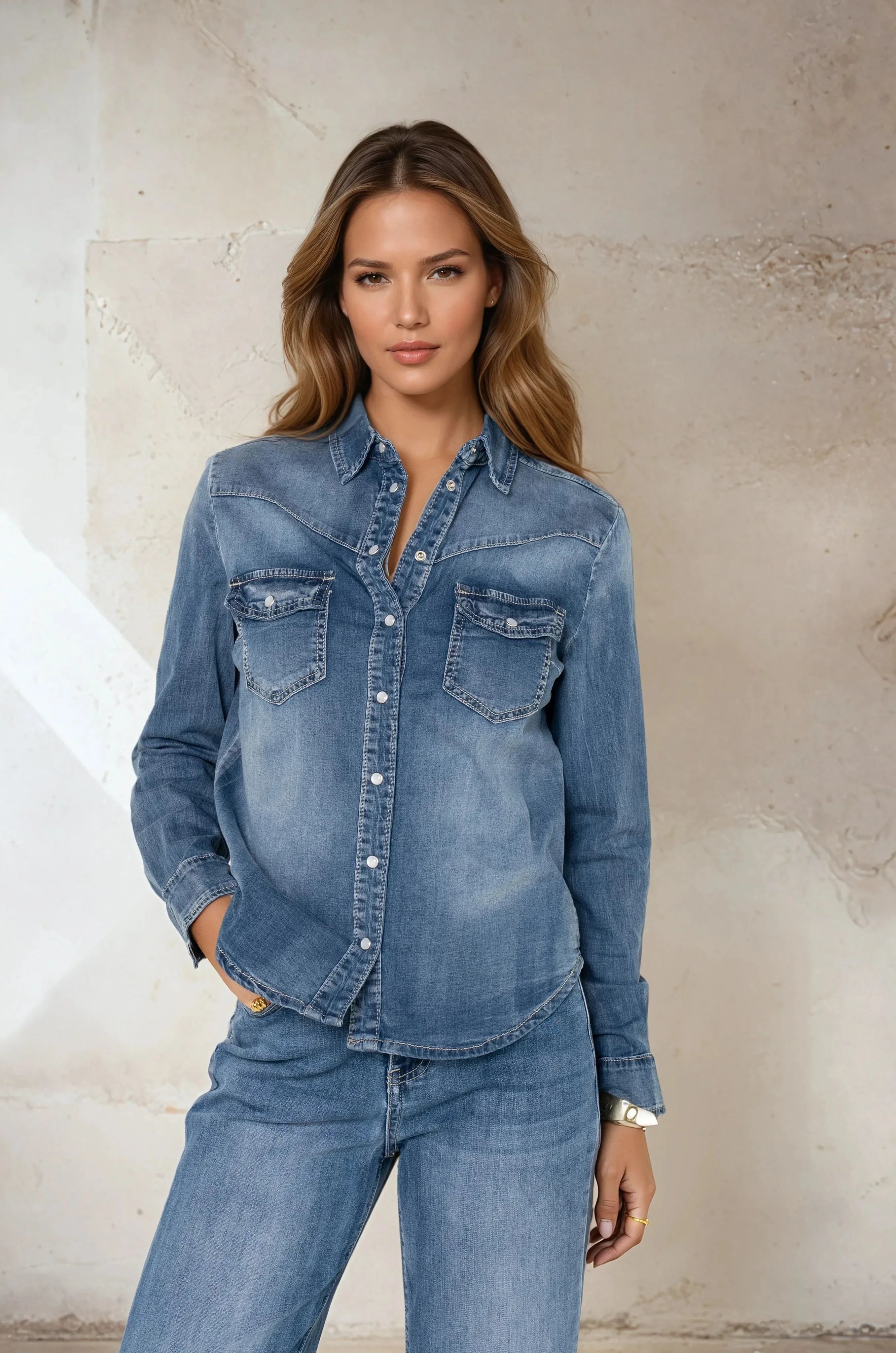 En tidløs garderobeklassikere fra det franske brand Placer du jour - Denne jeans -shirt kombinerer klassisk vestlig -inspireret design med en moderne, feminin pasform. Med push -knapper foran, to brystlommer med lommehætte og en blød, kompatibel denimkvalitet, er det både stilfuldt og behageligt at have på.