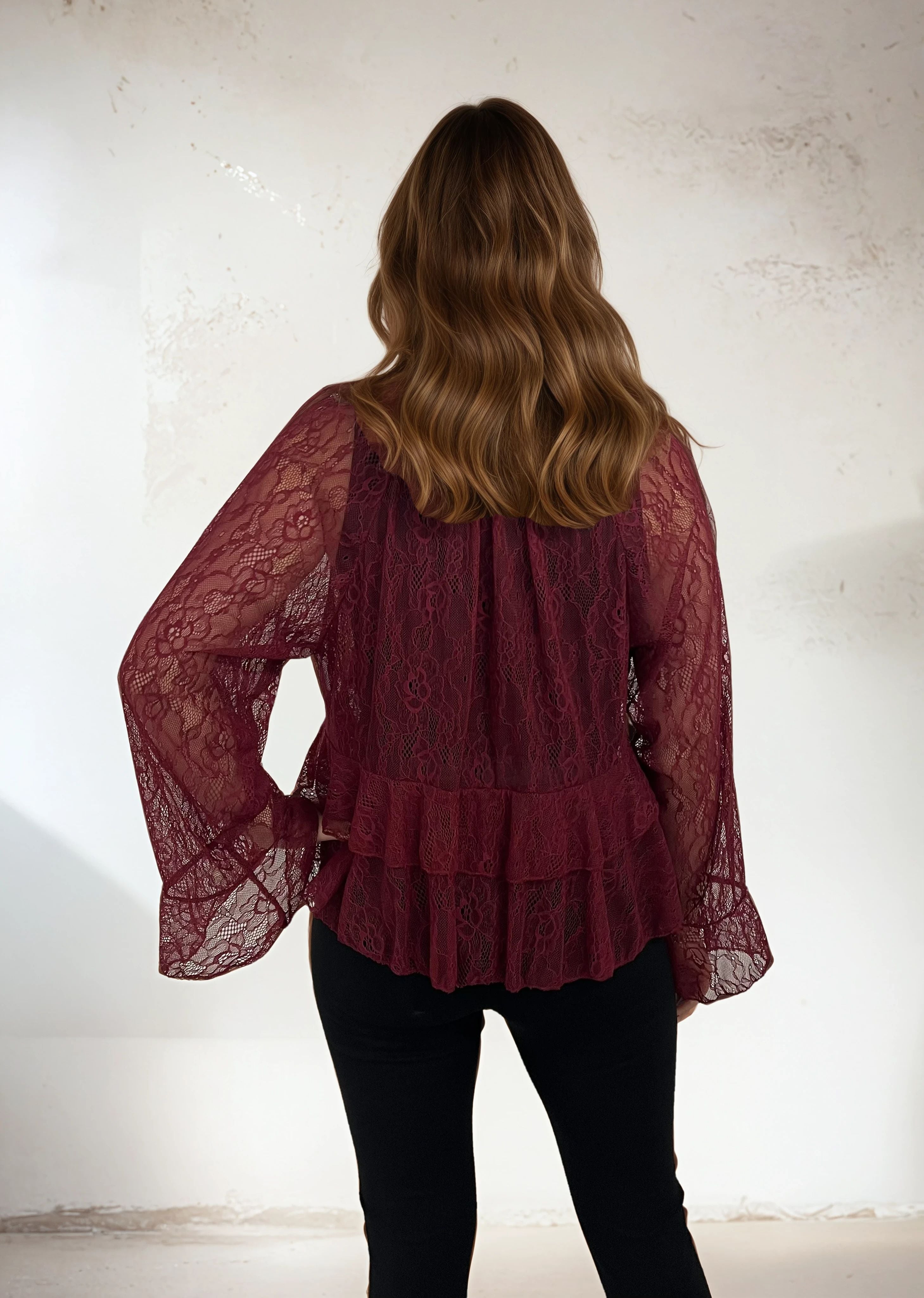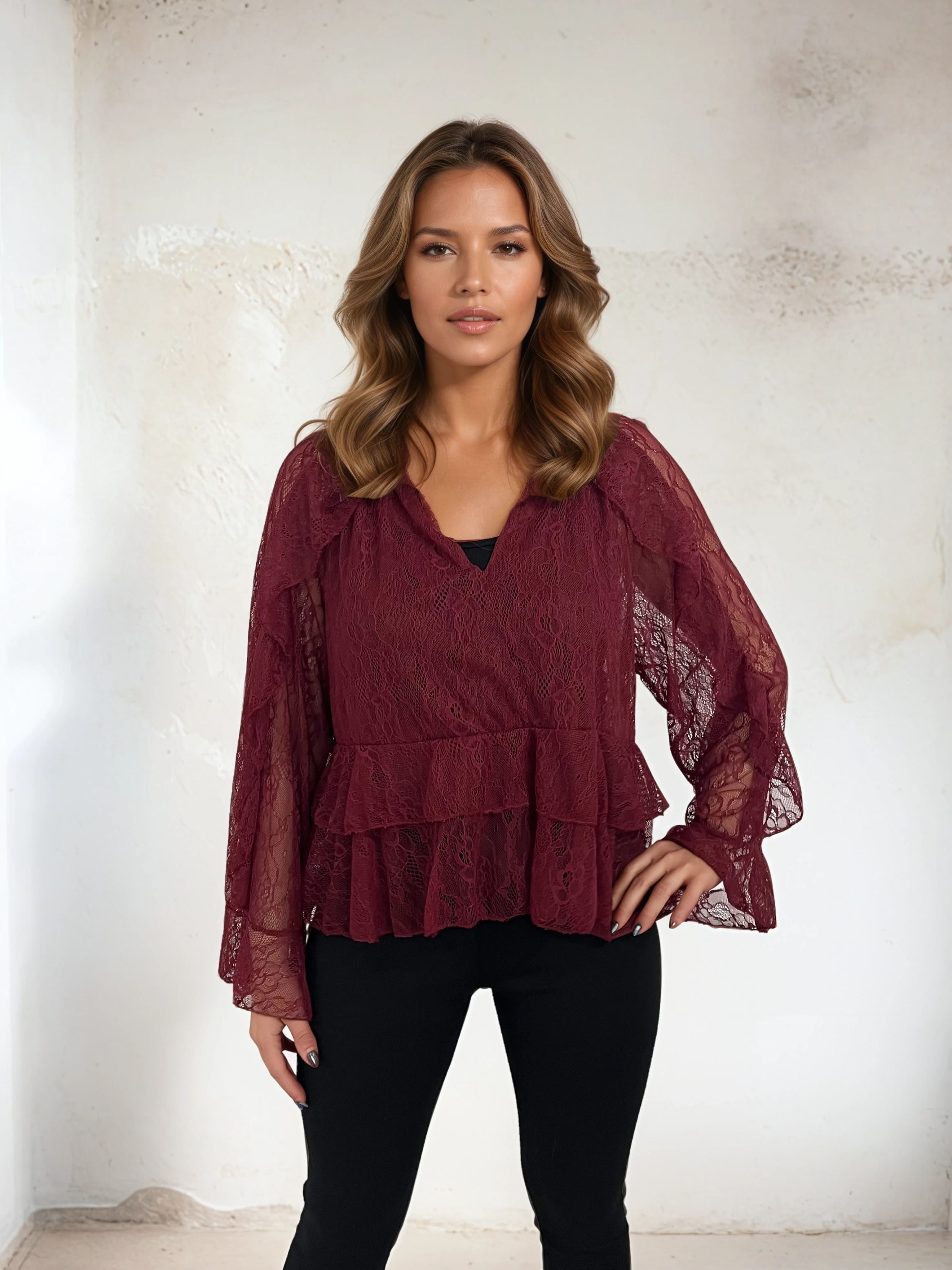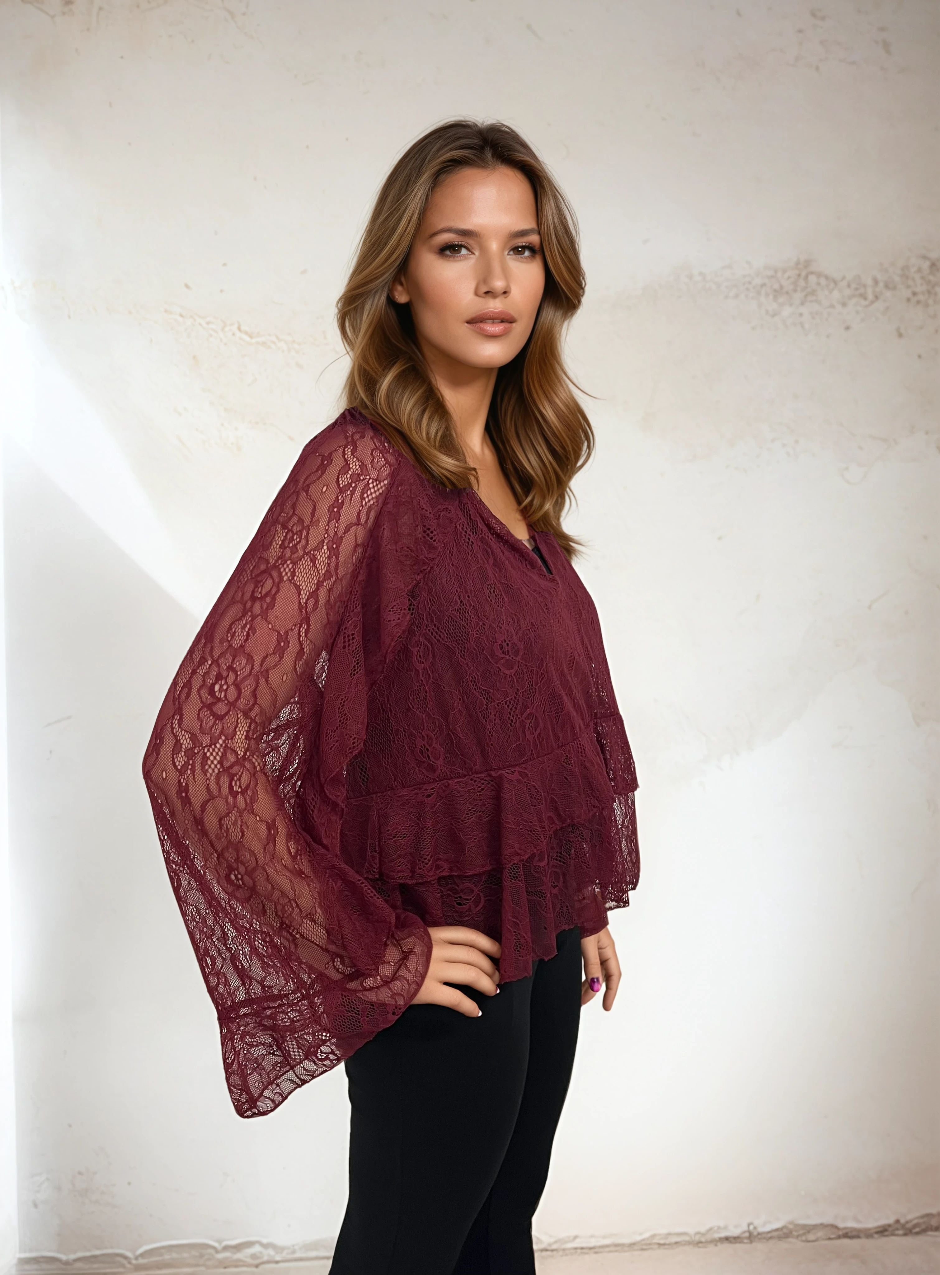Elegant og tidløs blondebluse fra vores eget mærke Mirelle Design, lavet i Italien. Blusen har et smukt, feminint design med let udskårne ærmer og dobbelte flæser forneden for et blødt fald og en romantisk følelse. Det gennembrudte blondemateriale gør den både luftig og elegant - perfekt til både hverdag og fest.