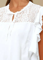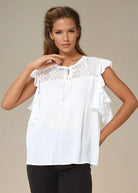 Denne Ærmeløs top med ruffles er en feminin og elegant top med smuk Blonderdetaljer øverst. De Rund krave bundet sammen med to dekorative Band, der giver et sofistikeret og romantisk touch. Den luftige pasform og bløde materialeblanding gør den både behagelig og stilfuld - perfekt til varme dage eller som et lag under en jakke.