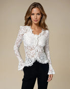 Feminin og sofistikeret-denne blonder top med sin V-ring prydet med flæser, der giver en let og elegant fornemmelse. Den integrerede bondeufodire giver komfort og skøn, mens den subtile gennemsigtighed af spidsens subtile gennemsigtighed. En elegant og trendy top, perfekt til at løfte både hver dag og aften.