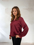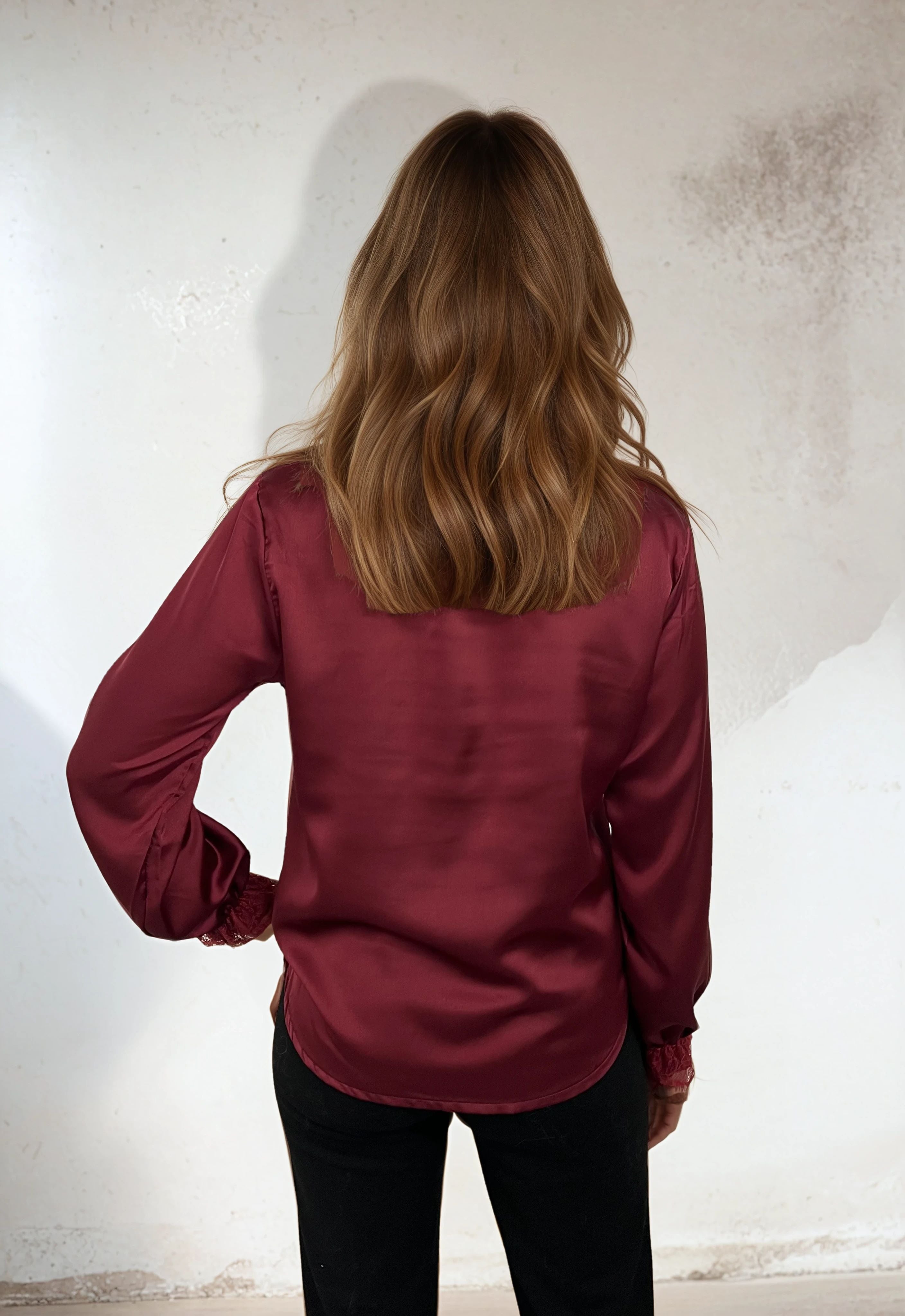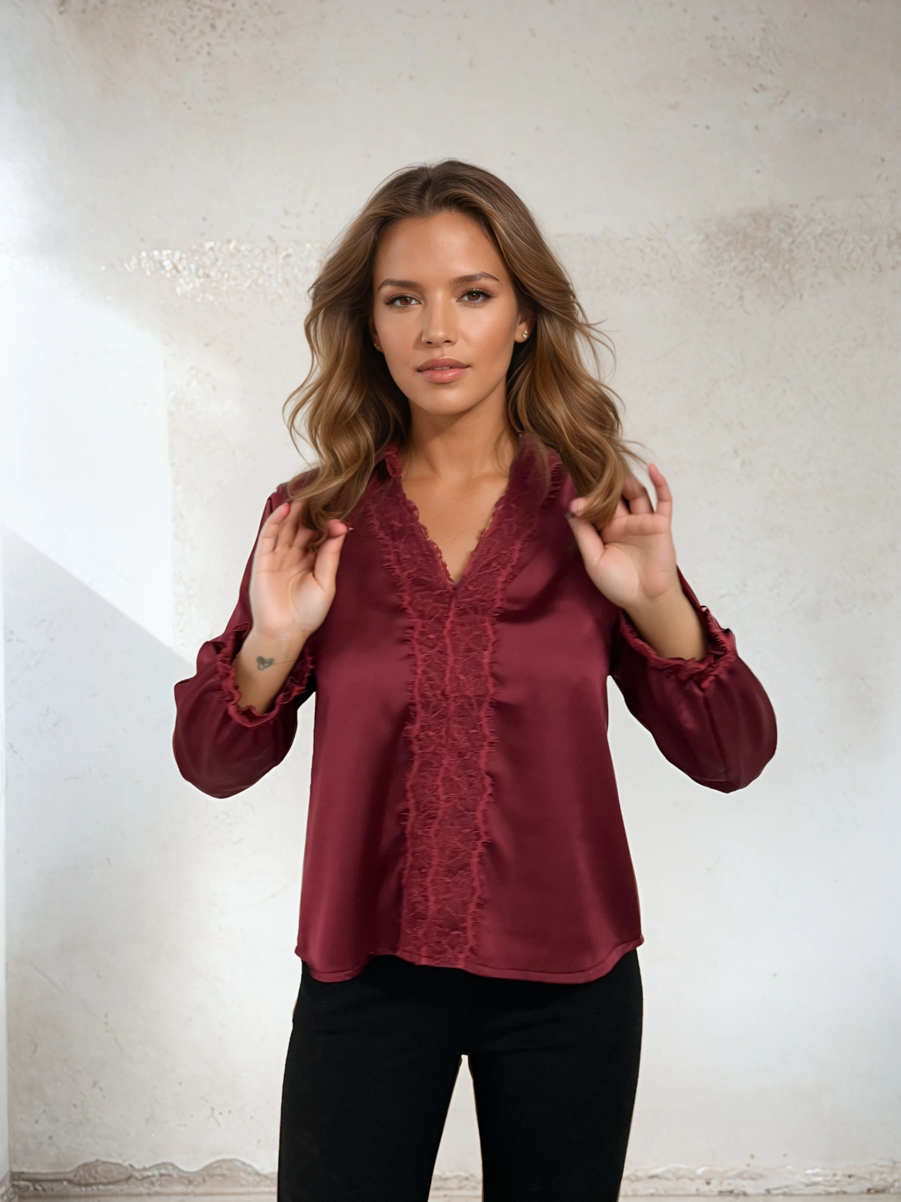 En elegant bluse med v-udskæring med dekorative blonder foran og ved ærmerne. Den har en fin pasform, behagelig pasform og fungerer både til hverdag og fest. Lavet i Italien for Mirelle Design.