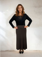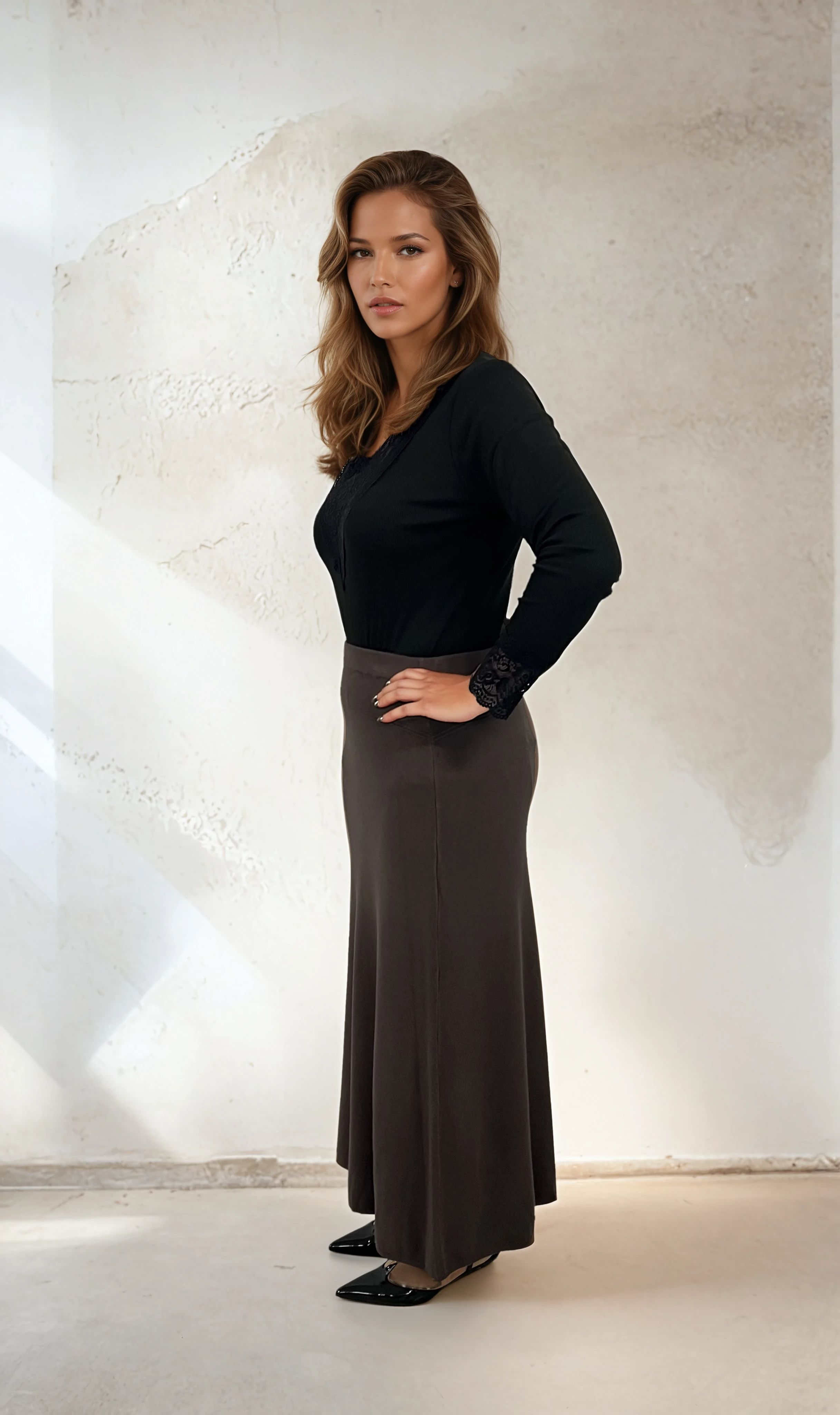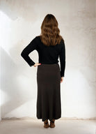 Ebba er en elegant og behagelig finstrikket nederdel med et smukt fald og let udspilet silhuet. Den har en bred elastik i taljen, som gør, at den sidder behageligt og former sig flot efter kroppen. Perfekt at kombinere med en bluse, striktrøje eller blondetop for et tidløst og feminint look.