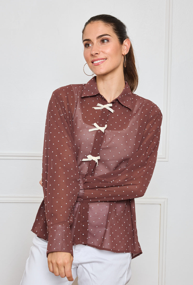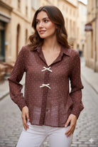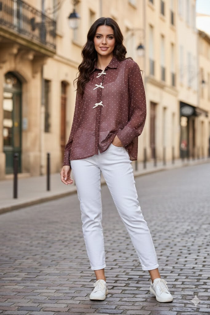 Blus Prickig er den perfekte blanding af romantisk og trendy - med en let, luftig pasform og et prikket mønster, der aldrig går af mode. Den har en feminin V-udskæring, dekorative dikkedarer detaljer og et bindebånd foran, der giver en blød og elegant silhuet. Ærmerne er langærmede med let volumen, som gør at blusen føles både smart og behagelig.