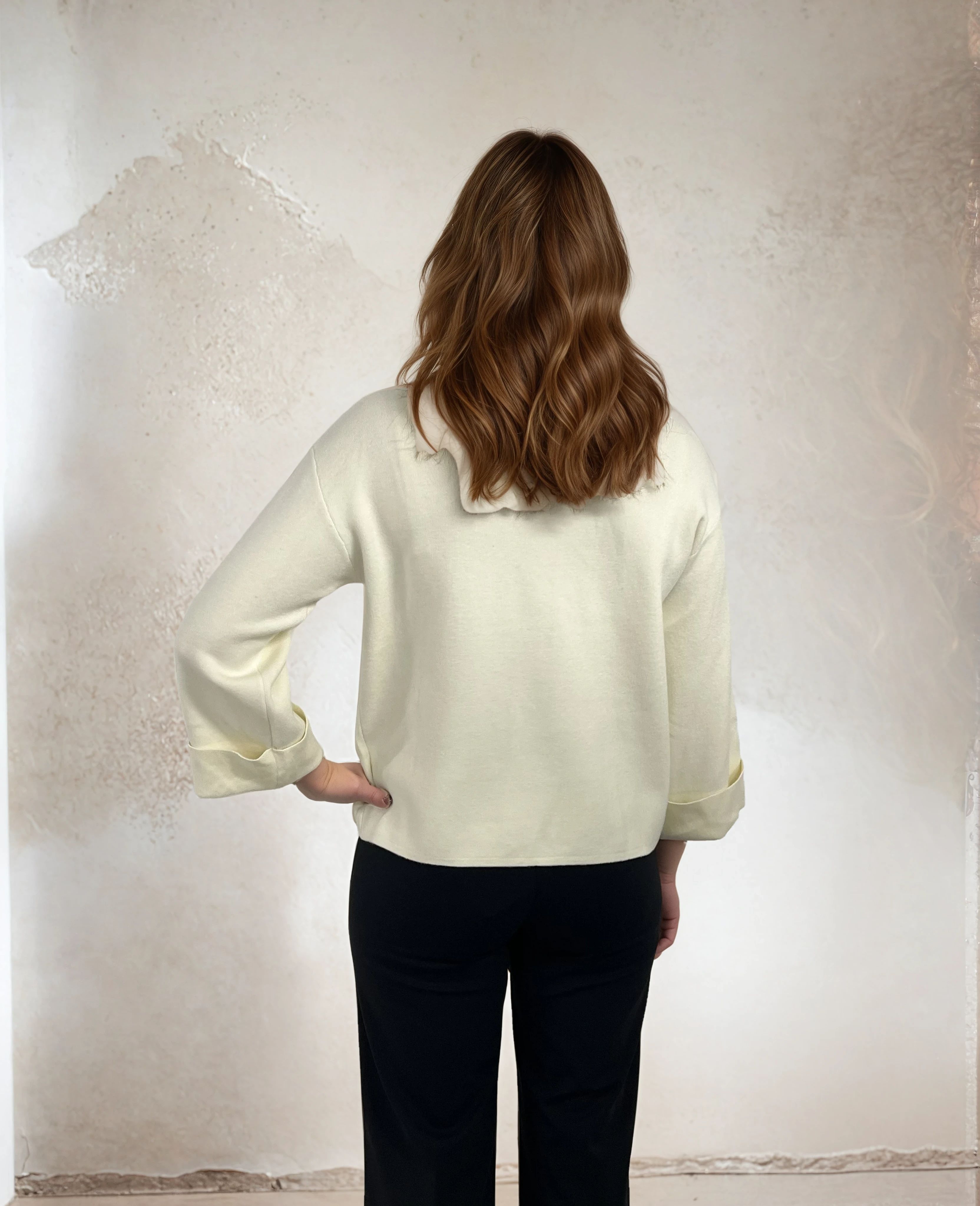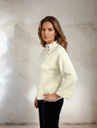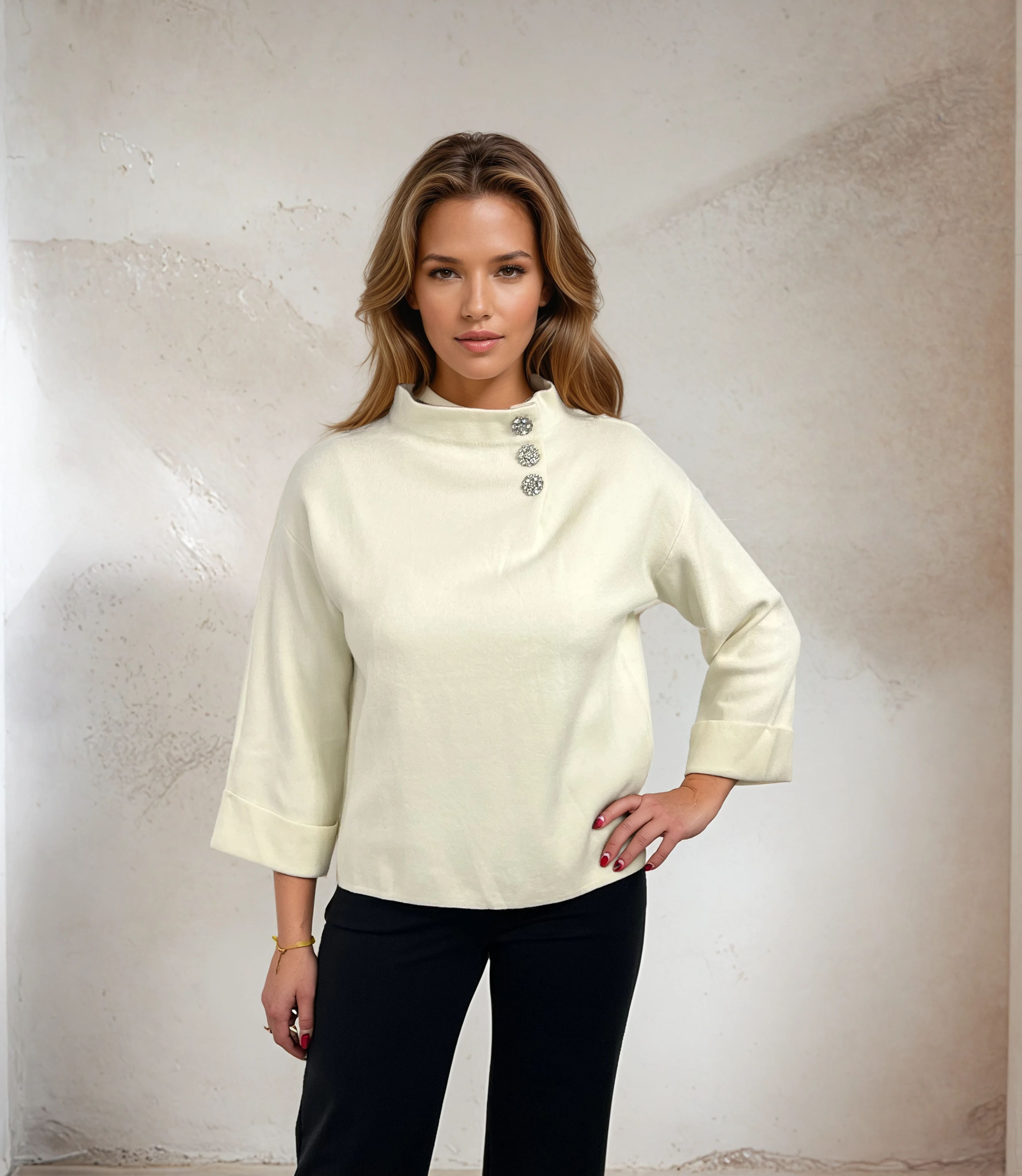 Daisy er en elegant og stilfuld finstrikket sweater med smukke dekorative rhinstensknapper langs den høje krave. Modellen har en let boxy pasform og trekvart ærmer med opslået kant, som giver et sofistikeret men afslappet udtryk. Perfekt til både bukser og nederdele - en rigtig favorit til både hverdag og fest.
