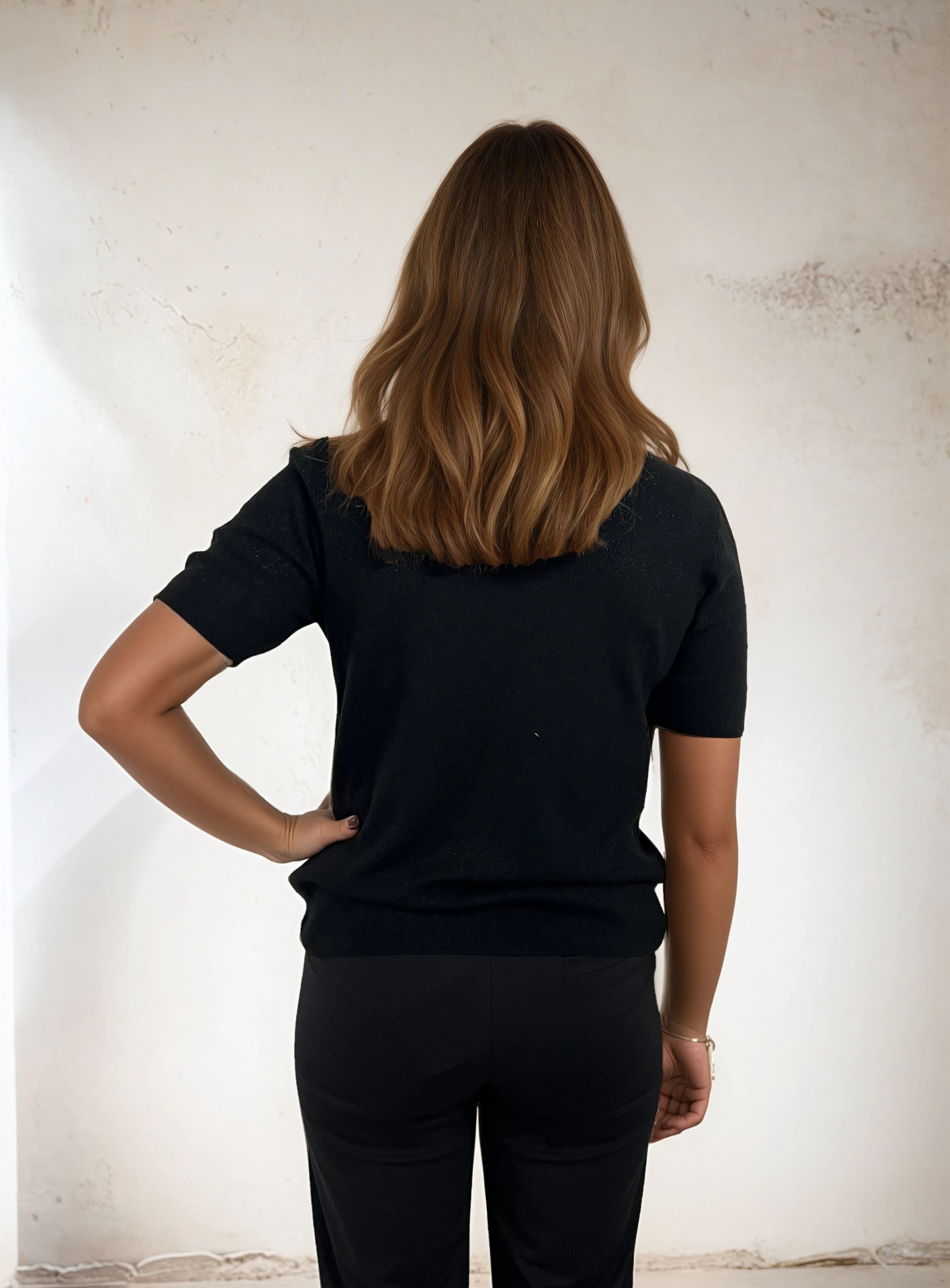 Hilma er en elegant finstrikket sweater med korte ærmer og en smuk rhinstensbroche foran, der giver et sofistikeret og festligt præg. Garnet indeholder sølv tråde som fanger lyset og giver beklædningen en diskret shimmer - perfekt til både hverdag med lidt ekstra og festlige lejligheder.