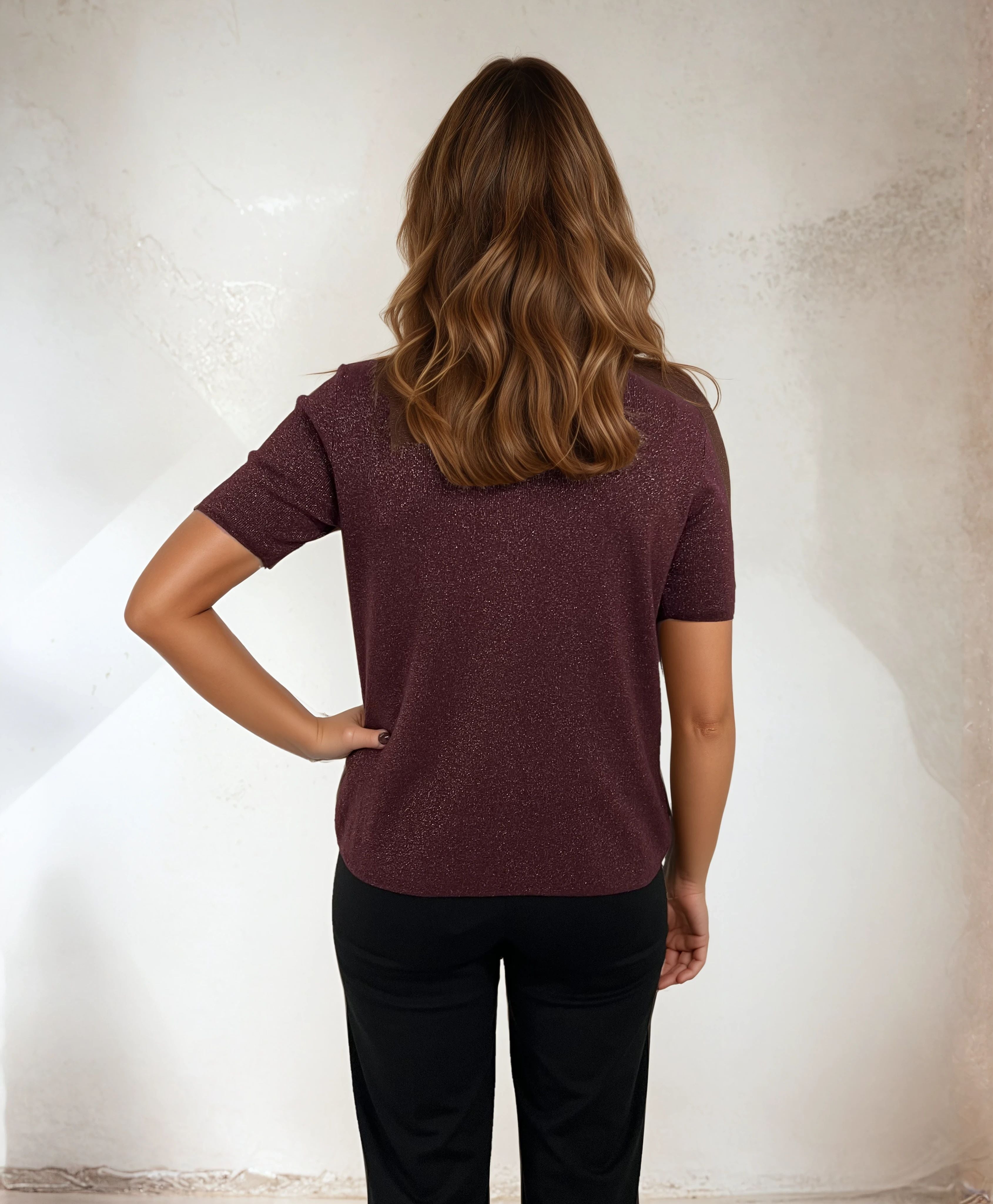 Hilma er en elegant finstrikket sweater med korte ærmer og en smuk rhinstensbroche foran, der giver et sofistikeret og festligt præg. Garnet indeholder sølv tråde som fanger lyset og giver beklædningen en diskret shimmer - perfekt til både hverdag med lidt ekstra og festlige lejligheder.