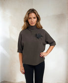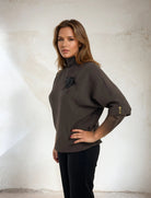 Sweateren har en højere krave, let afslappet pasform og trekvart ærmer med knapdetalje ved ærmerne - en tidløs model, der passer perfekt til både bukser og nederdele.