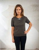 Hilma er en elegant finstrikket sweater med korte ærmer og en smuk rhinstensbroche foran, der giver et sofistikeret og festligt præg. Garnet indeholder sølv tråde som fanger lyset og giver beklædningen en diskret shimmer - perfekt til både hverdag med lidt ekstra og festlige lejligheder.