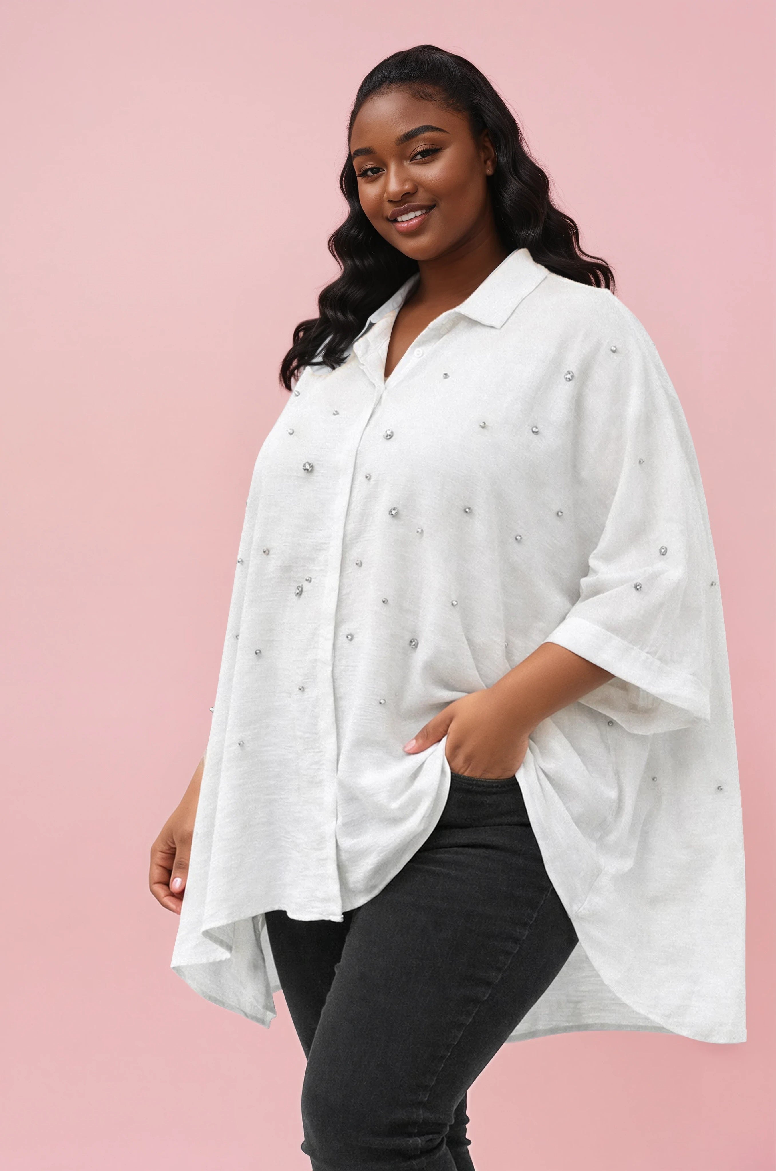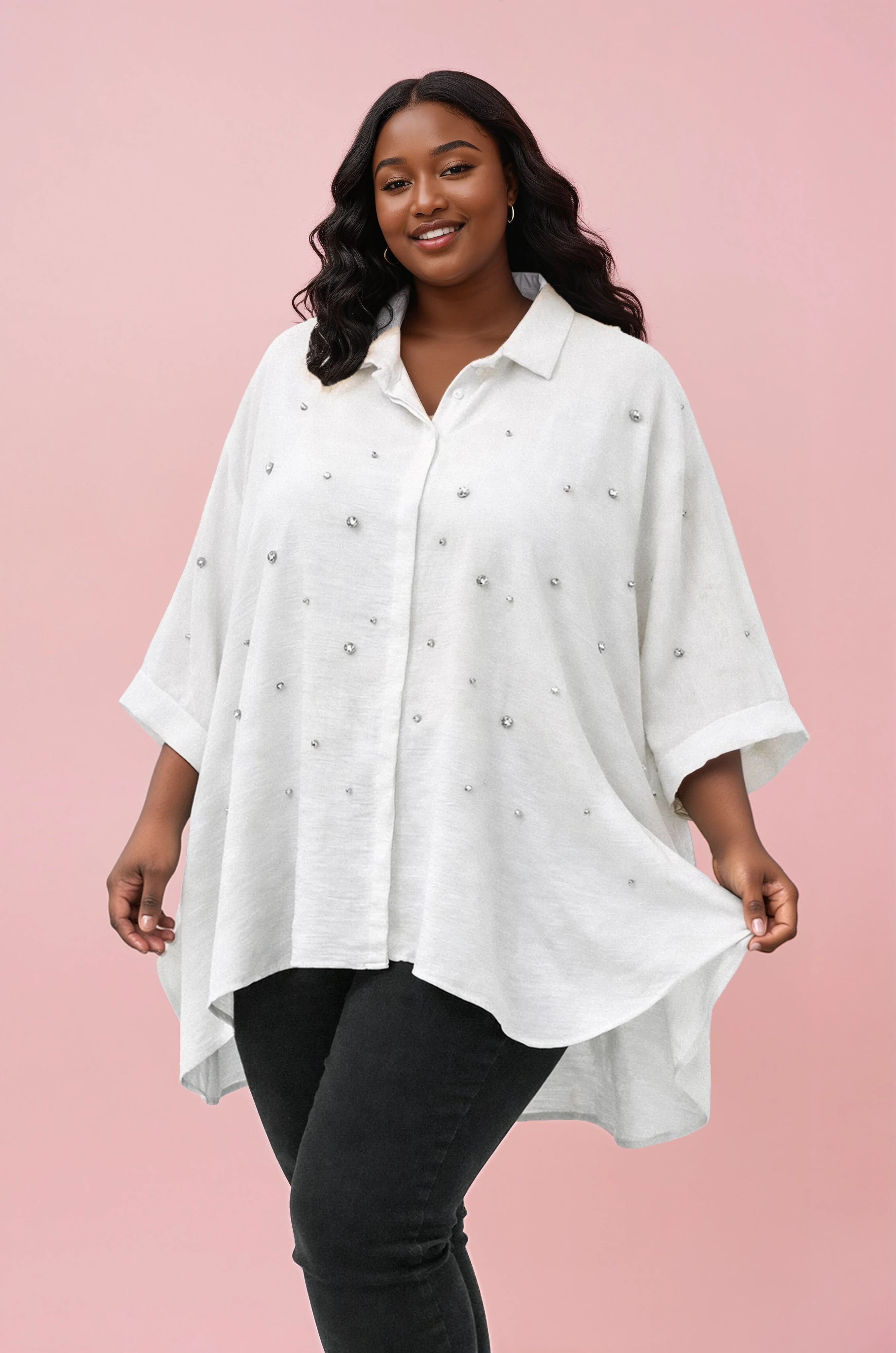 En stilfuld og luftig oversized bluse med smukke stendetaljer, der giver et elegant og eksklusivt indtryk. De diskret placerede funklende sten er spredt ud over hele fronten og skaber et feminint look, der løfter tøjet uden at føle for meget.