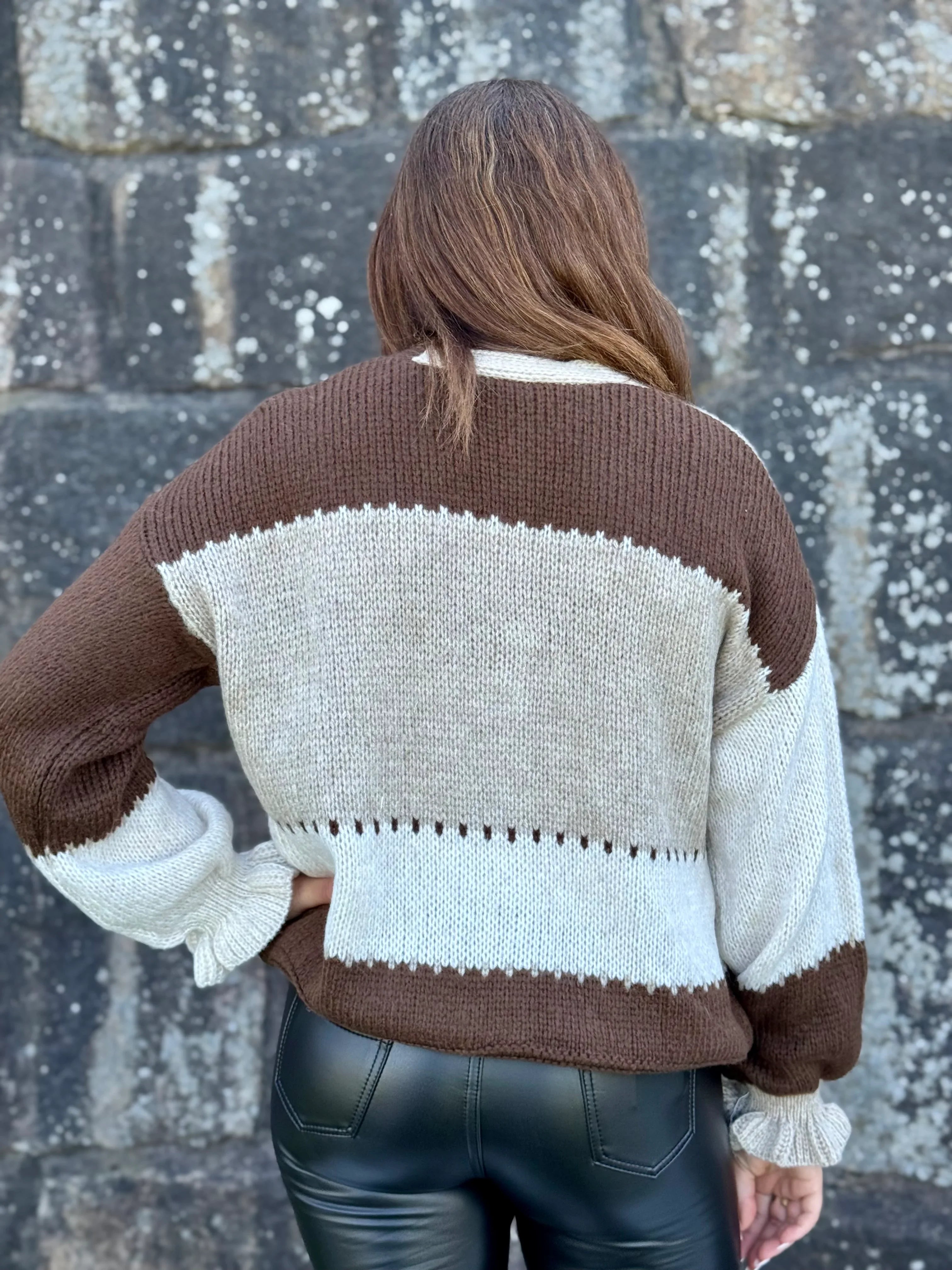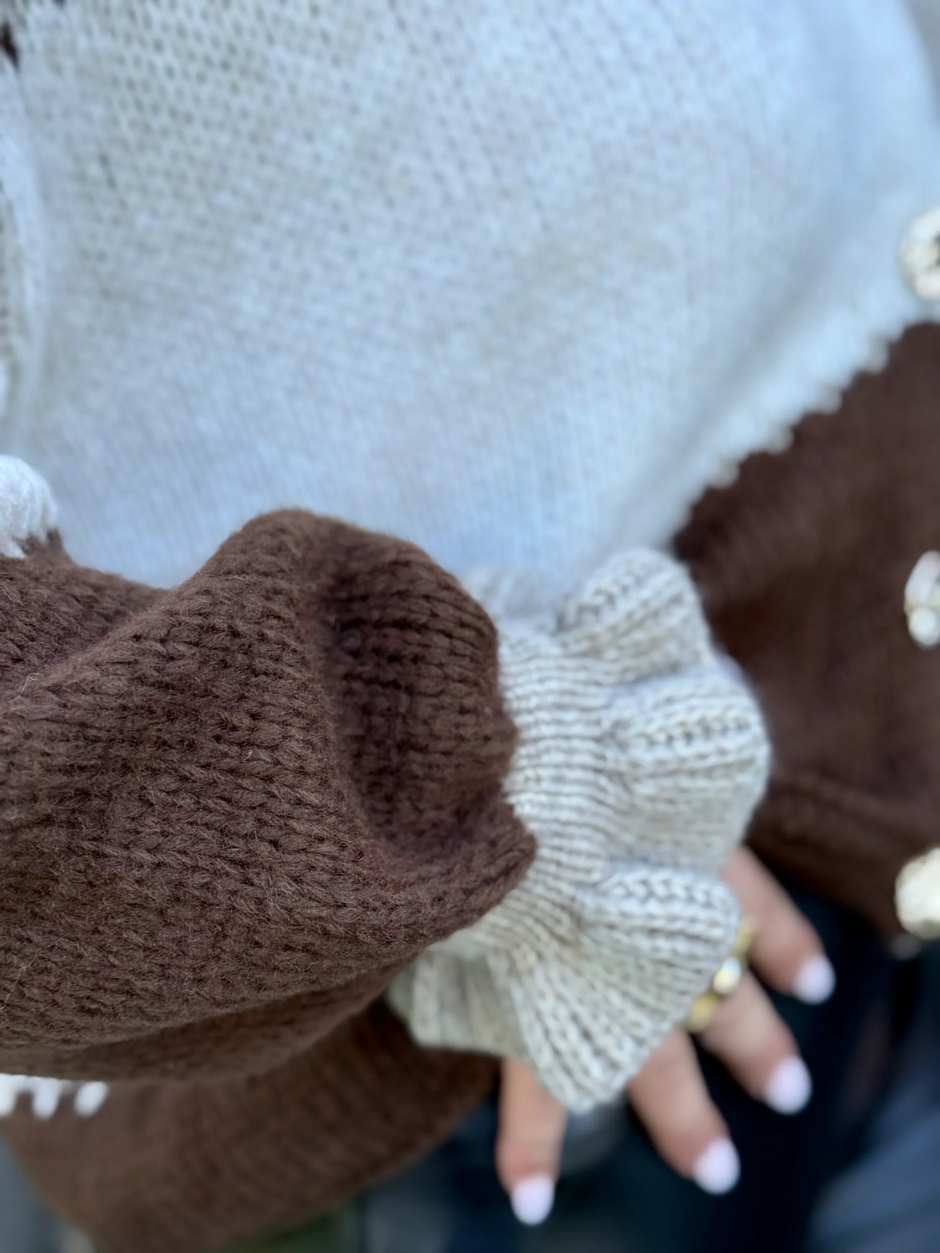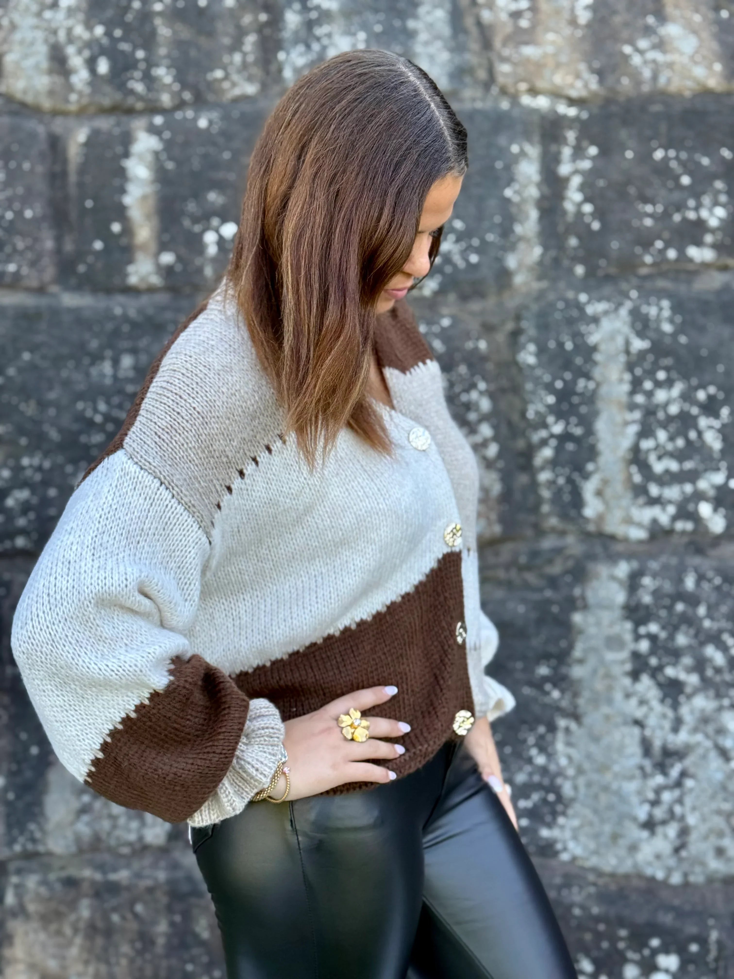 En blød og trendy strikket cardigan i ensstørrelsesmodel, lavet i Italien. Designet i blokmønstre med felter i beige, off -hvid og brun. Mellem hvert felt kører dekorative linjer, der giver ekstra detaljer. Modellen er V-hals og har en let ballonformet ærme til en moderne og afslappet silhuet. Uden en knap, hvilket gør det nemt at bære lag i lag.