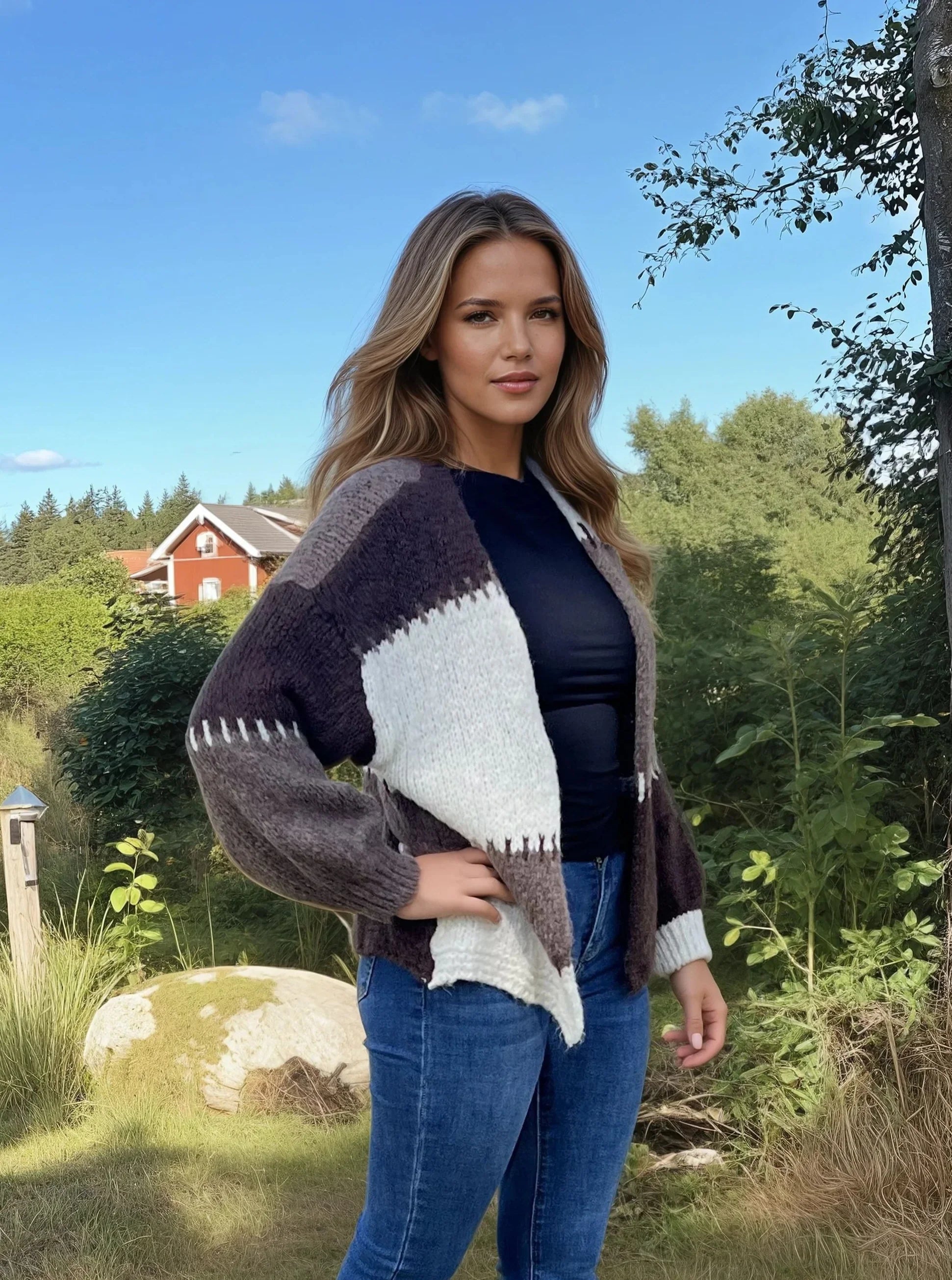 En blød og trendy strikket cardigan i ensstørrelsesmodel, lavet i Italien. Designet i blokmønstre med felter i beige, off -hvid og brun. Mellem hvert felt kører dekorative linjer, der giver ekstra detaljer. Modellen er V-hals og har en let ballonformet ærme til en moderne og afslappet silhuet. Uden en knap, hvilket gør det nemt at bære lag i lag.