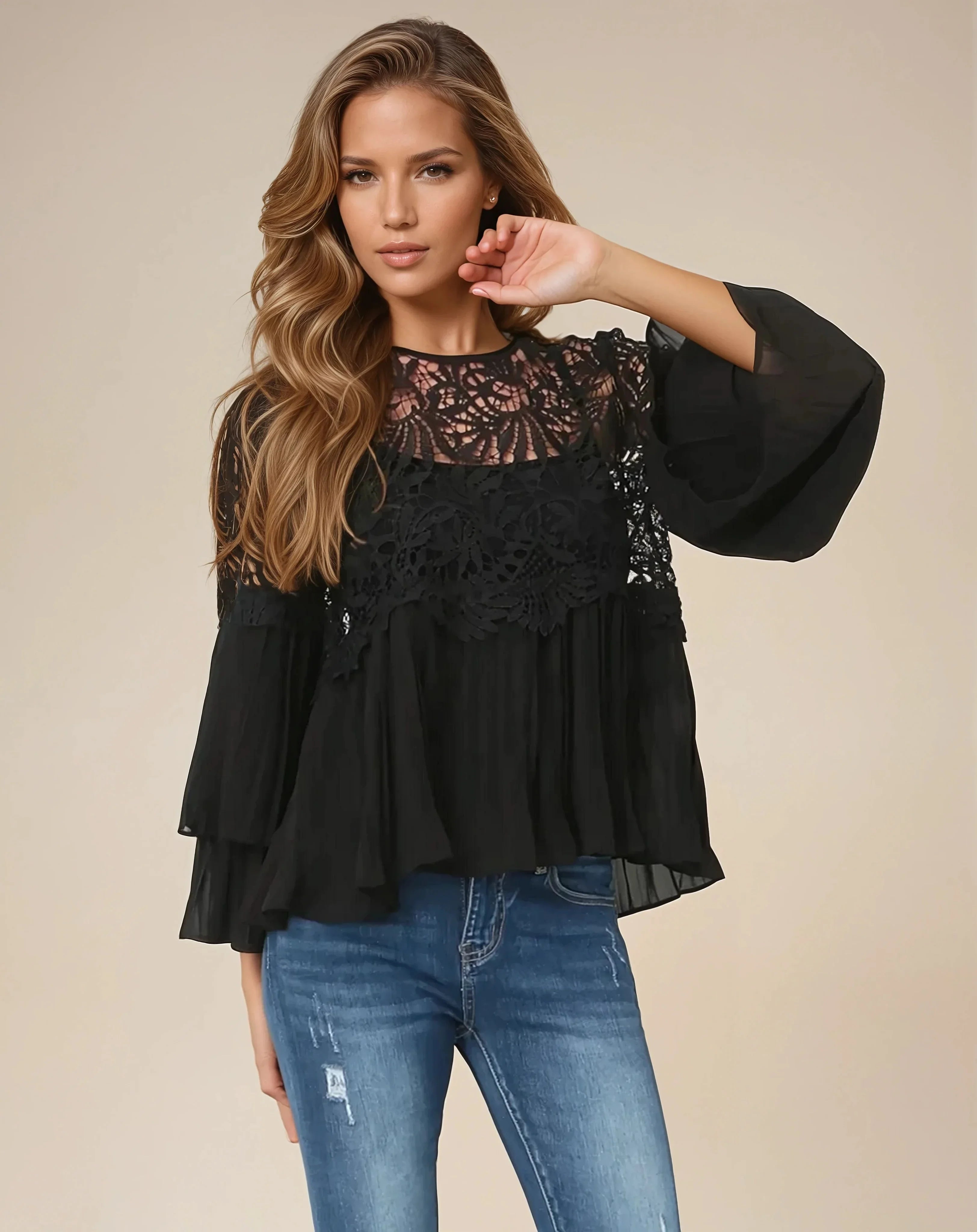 Bluse Jennie er en elegant og feminin bluse med Smukke blonderdetaljer og plisseret stof hvilket giver et sofistikeret look. De bred ærme Opretter en stilfuld silhuet, mens den rund halsudskæring og lange ærmer Giver et klassisk touch.