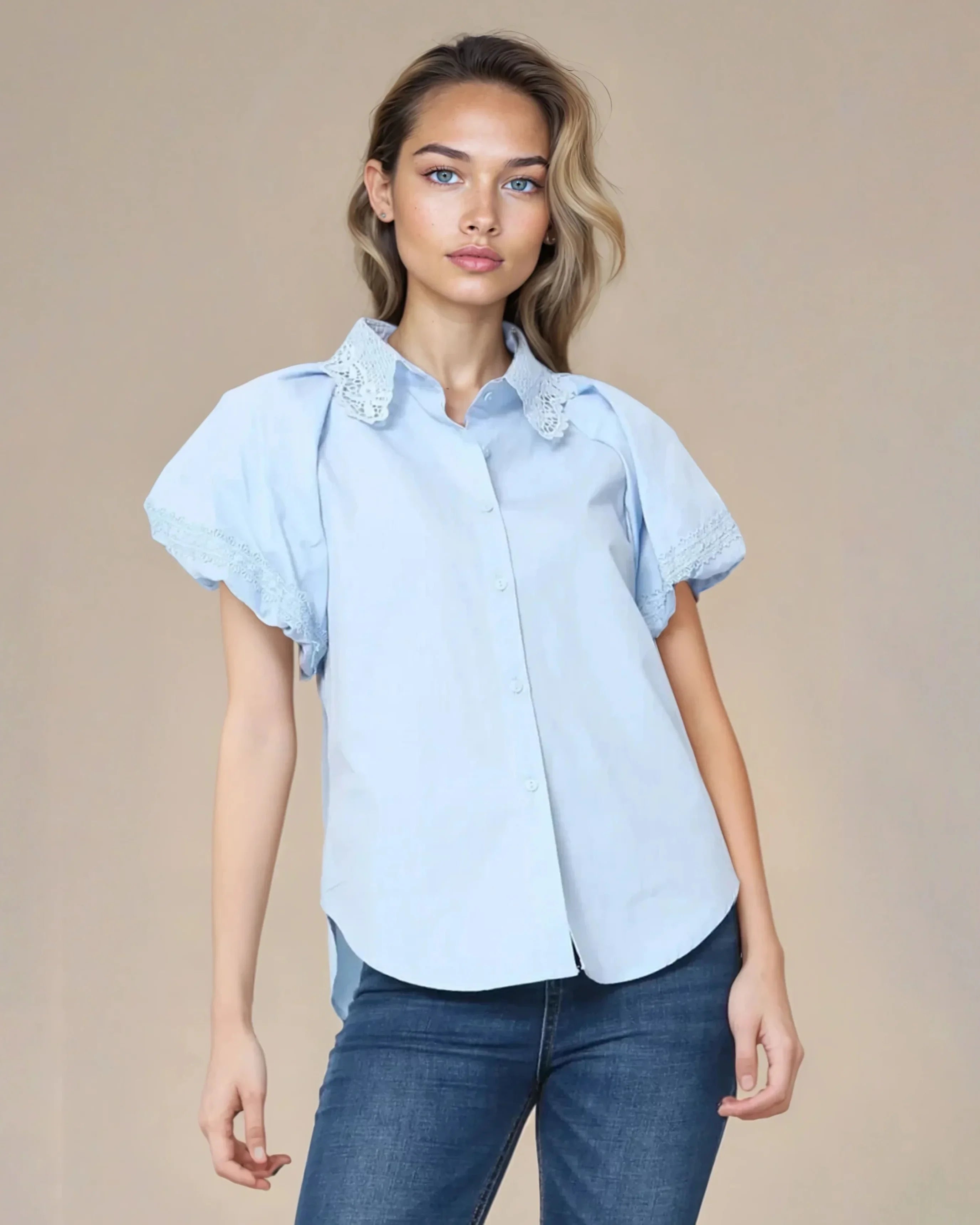 Romantisk mødes hver dag cool - denne bluse leverer Begge dele og. Med en smuk blonder -embroidered krave, puffbutik og ruffled ærme tager det dit kig fra "Jeg kastede bare på mig noget" til "Jeg har svært ved”På tre sekunder.