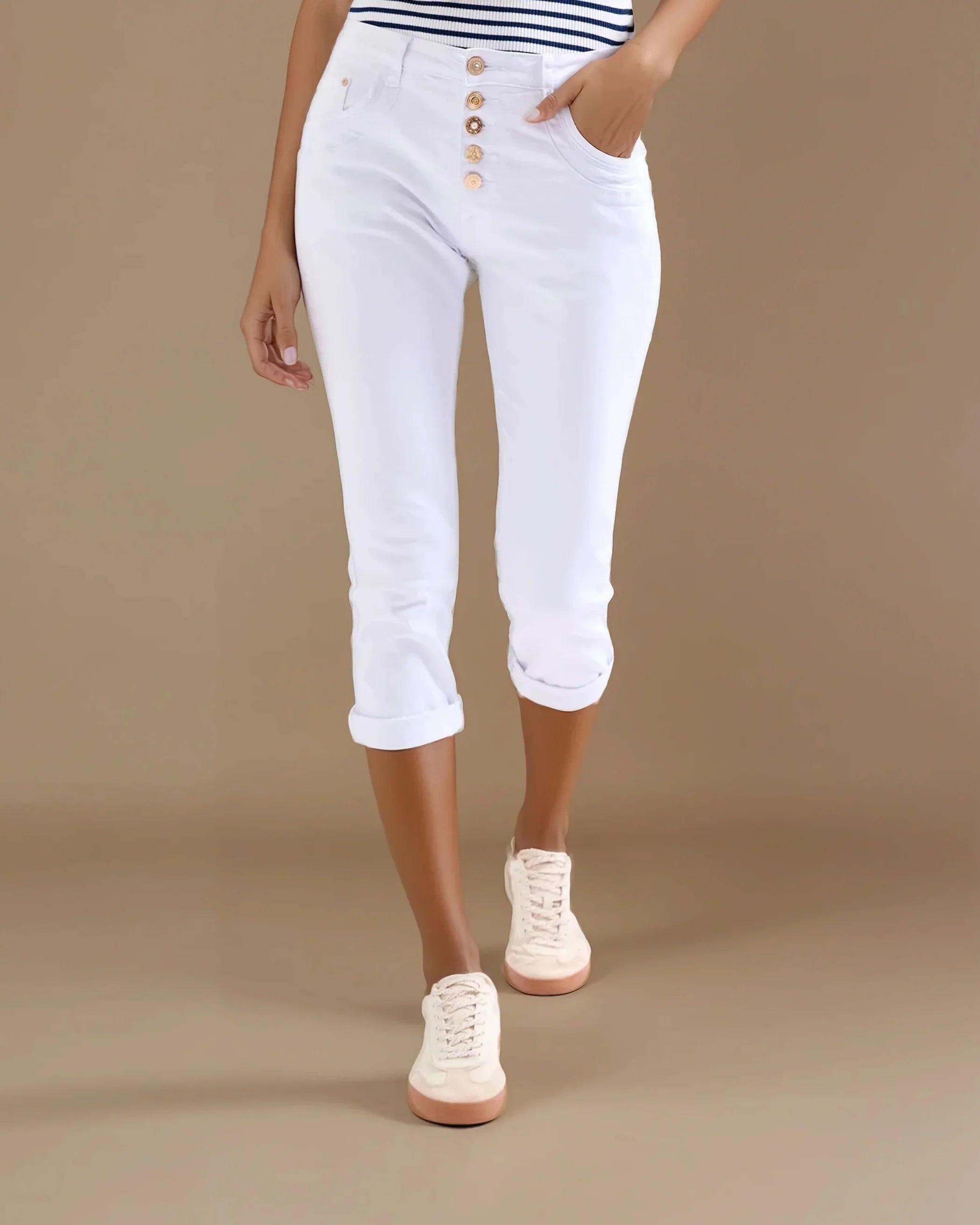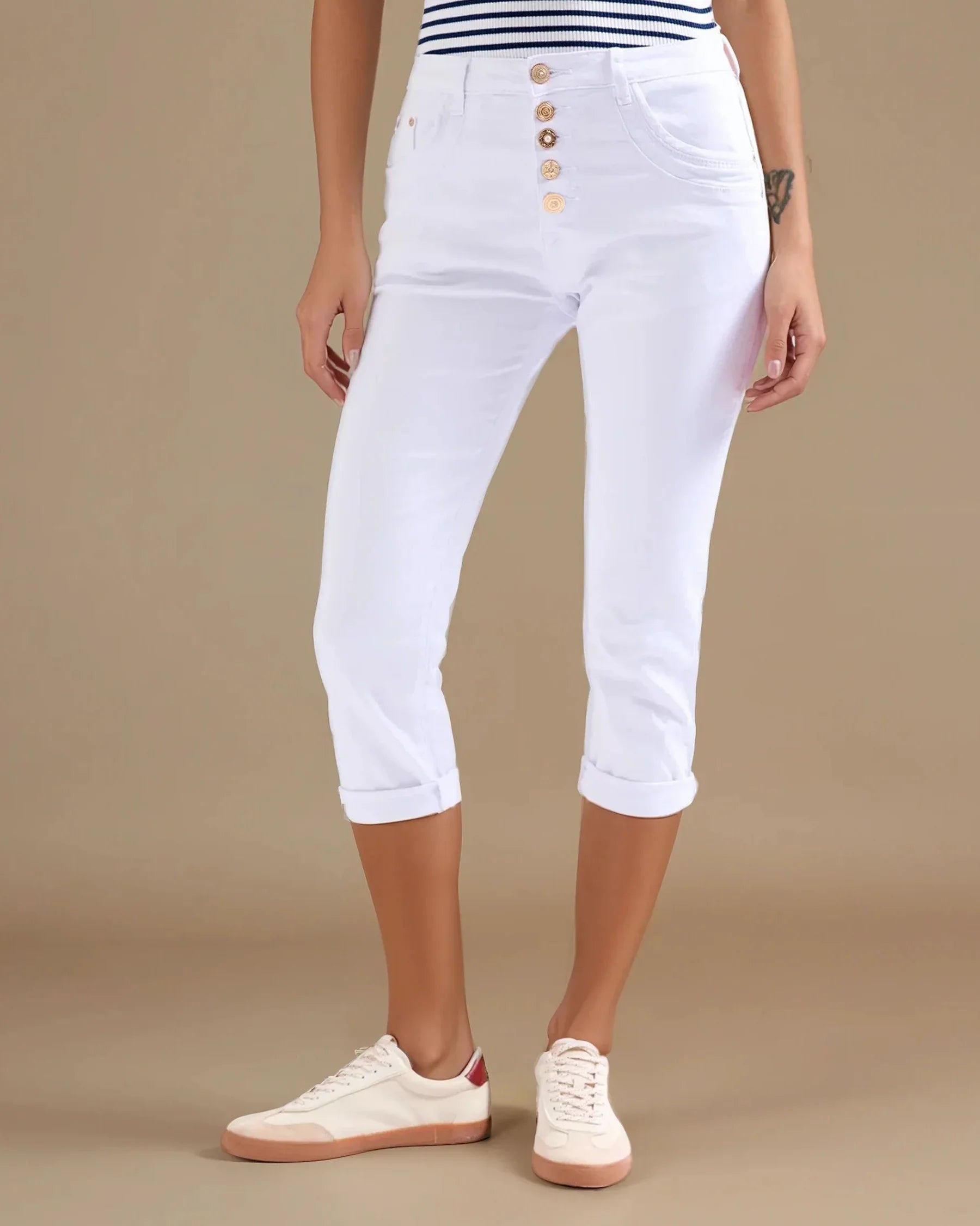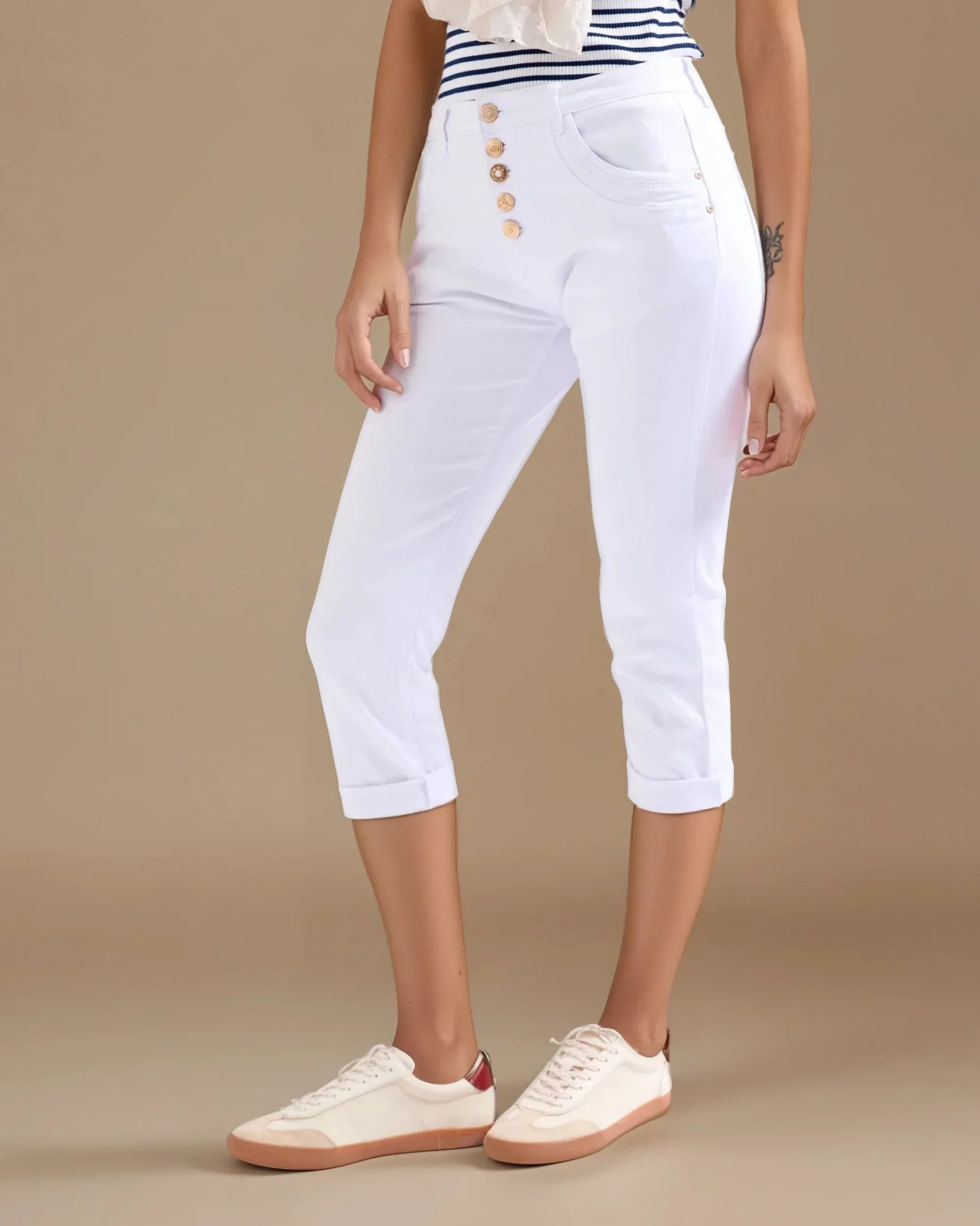 Disse capri -bukser er lavet af en blød og elastisk blanding af 97% bomuld og 3% elastane, og giver dig en figurpas, der samtidig giver dig mulighed for at bevæge dig frit. Med den klassiske høje talje og de stilfulde guldfarvede knapper foran, føler Lovis sig både luksuriøst og gratis på samme tid.