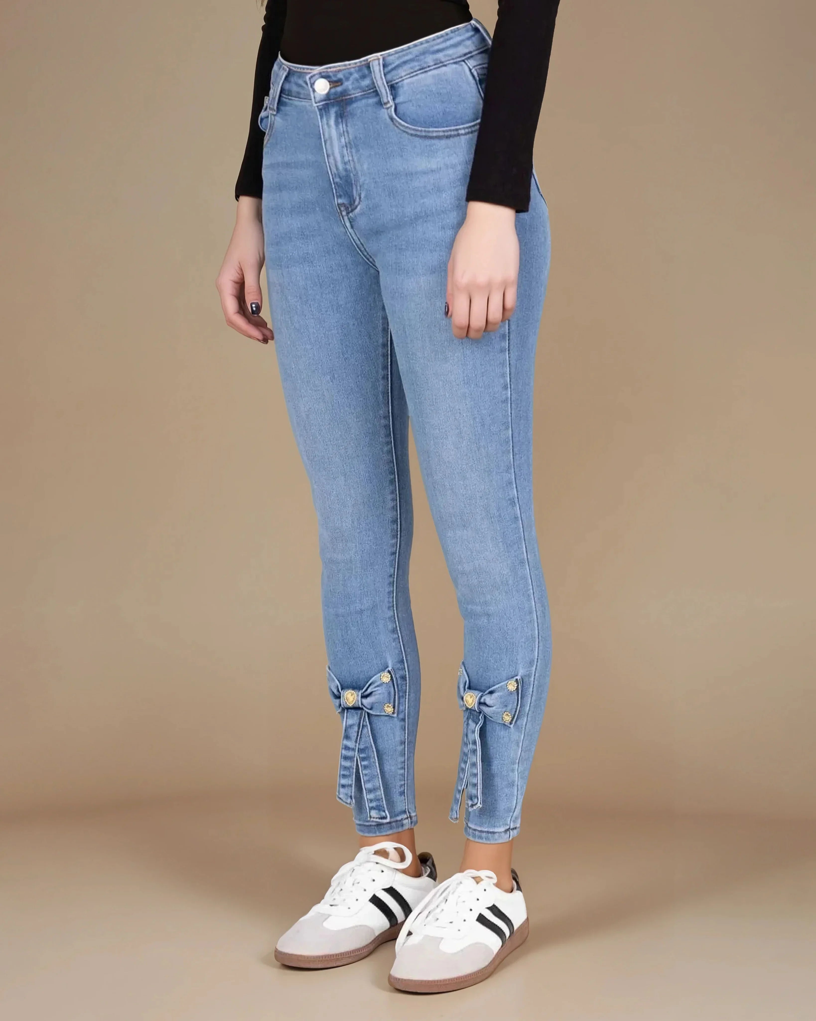 Jeans tynde stræk med buer - sød, smigrende og altid på punkt!