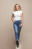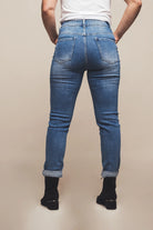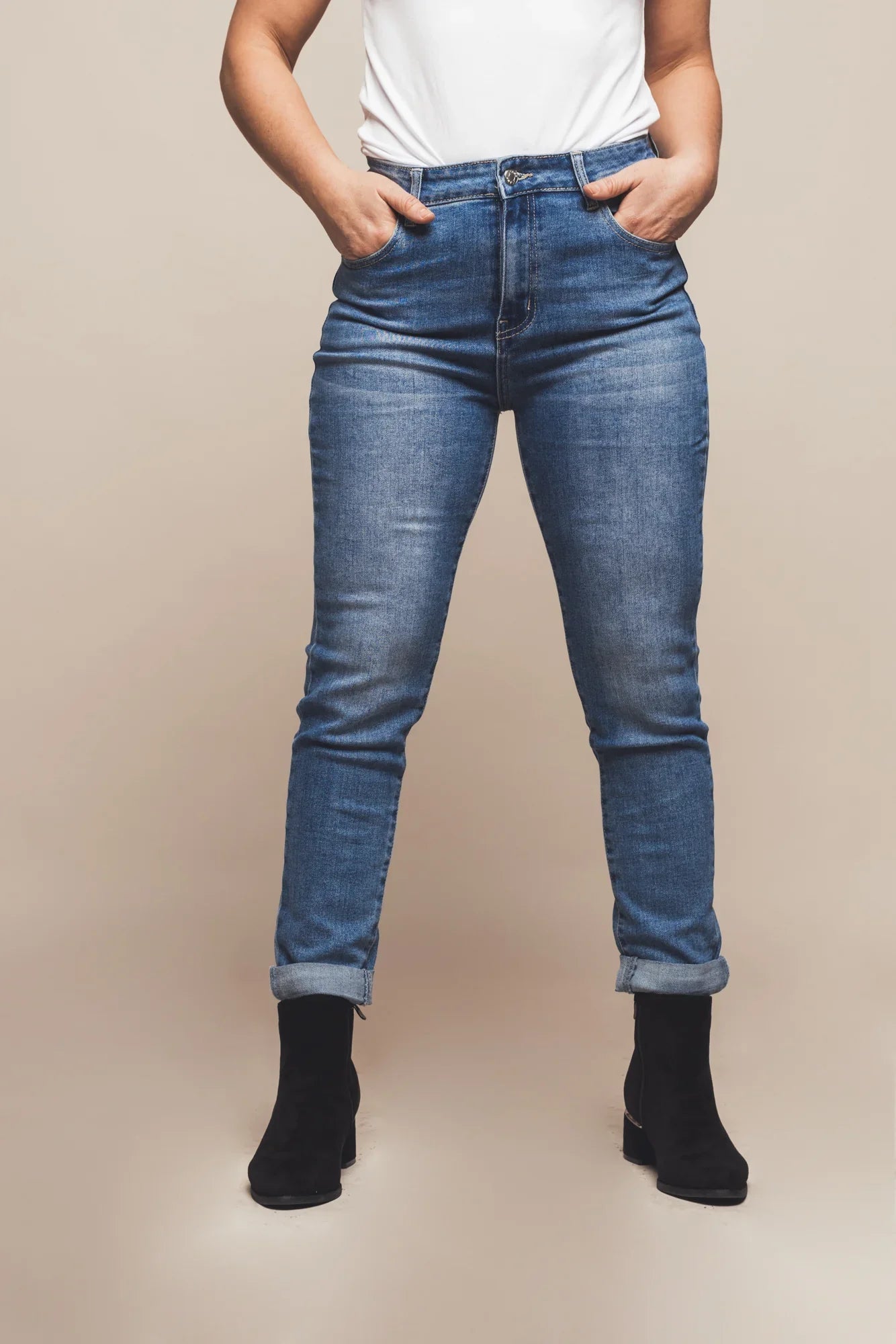 Maja jeans er designet i en mor passer-Model, en stil, der kombinerer klassisk charme med moderne bekvemmelighed. Mor passer Karakteriseret ved en høj talje, en løsere pasning omkring hofterne og lårene og en lidt snævrere benåbning. Dette design fremhæver taljen og skaber en smigrende silhuet, der passer til mange kropstyper. Mom Fit tilbyder et afslappet, men alligevel elegant look, perfekt til både hverdagen og festlige lejligheder.