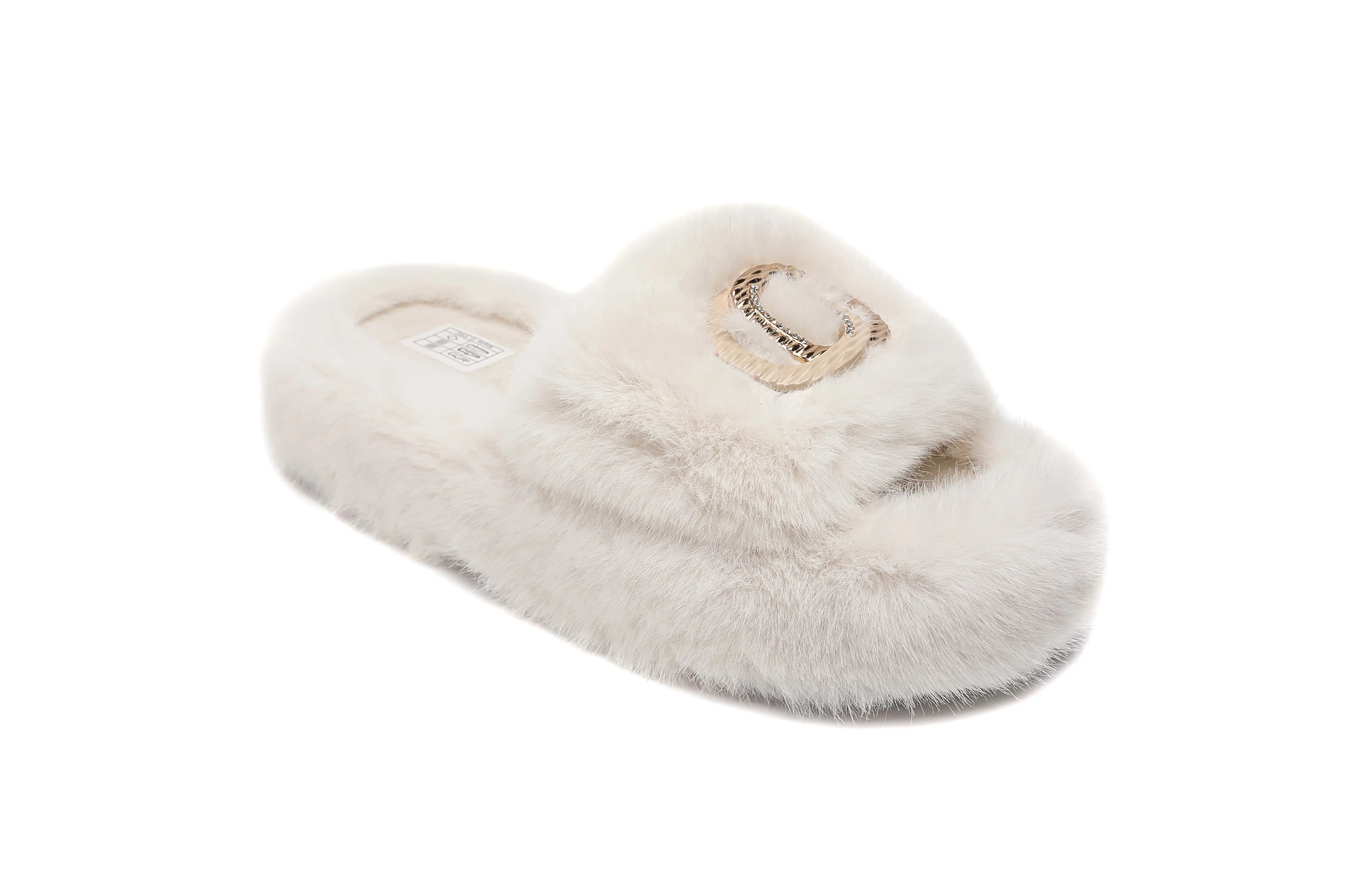 Disse fluffy slip-ins er varmende, luksuriøse og utrolig komfortable. Den bløde imiterede pels omslutter foden som en sky, mens spændet tilføjer et moderne og elegant touch. Et must for dem, der elsker komfort uden at gå på kompromis med stilen!